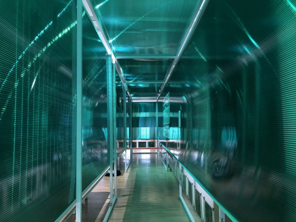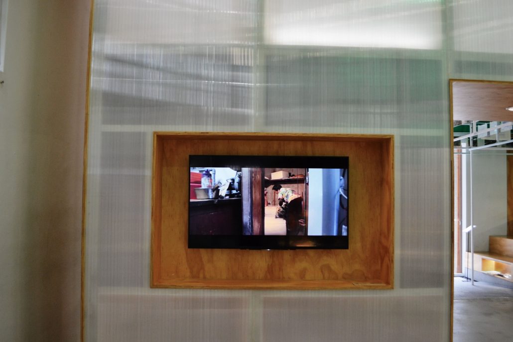 以早期常見於傳統市場中的綠色中空板,作為展區佈置的主要元素,在矩形奇幻空間內展示三位藝術家的市場創作。攝影創作者王嘉笙以科學的方式——市場溫度圖,表現傳統市場最為迷人之處「人情味」,當陽光灑落時,一幅幅人與人互動的美好畫面便隨著濃郁色彩一同浮現。