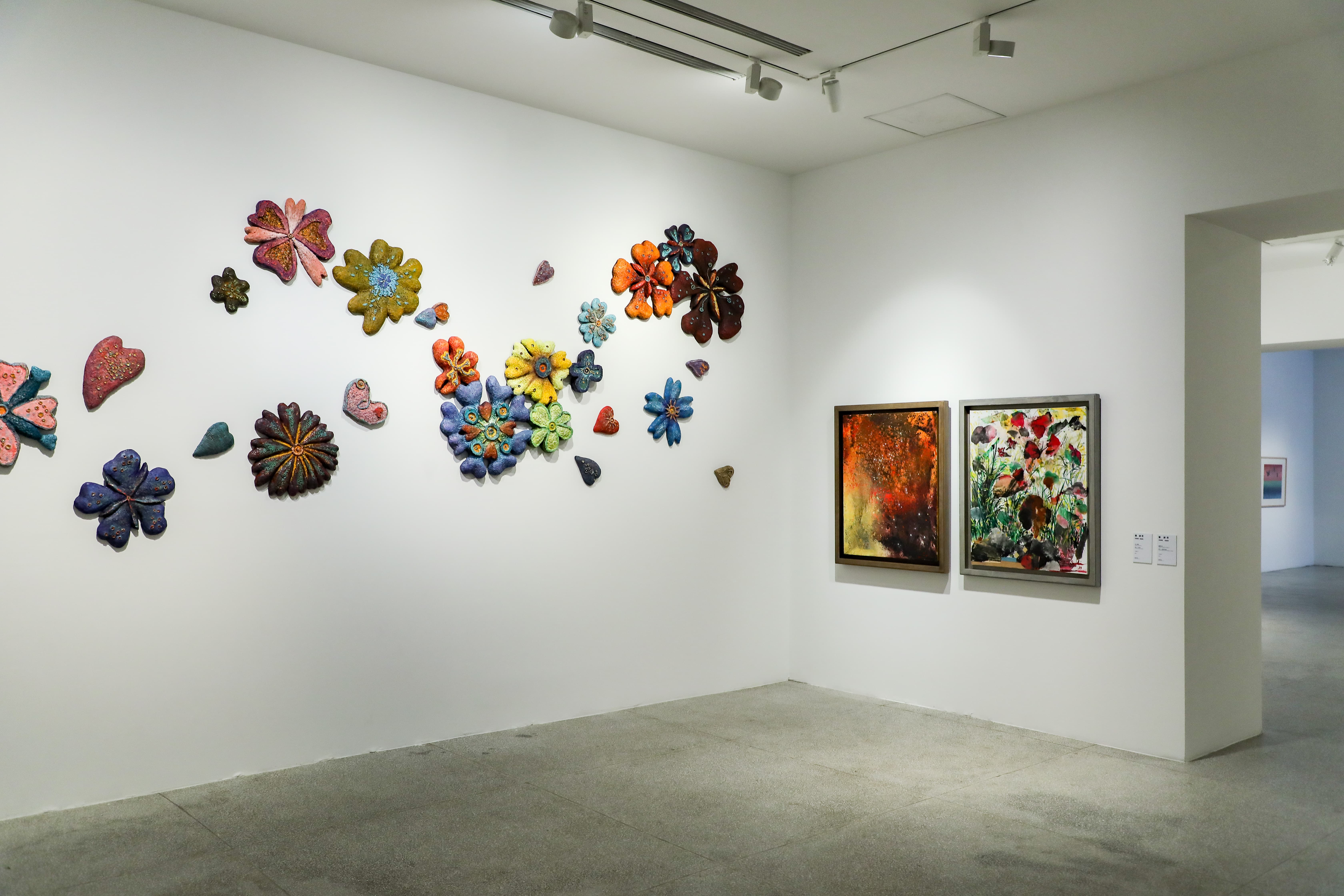 「鳳凰花開 蝴蝶飛」展間主視覺牆與曾英棟先生作品。