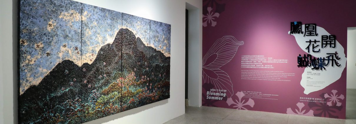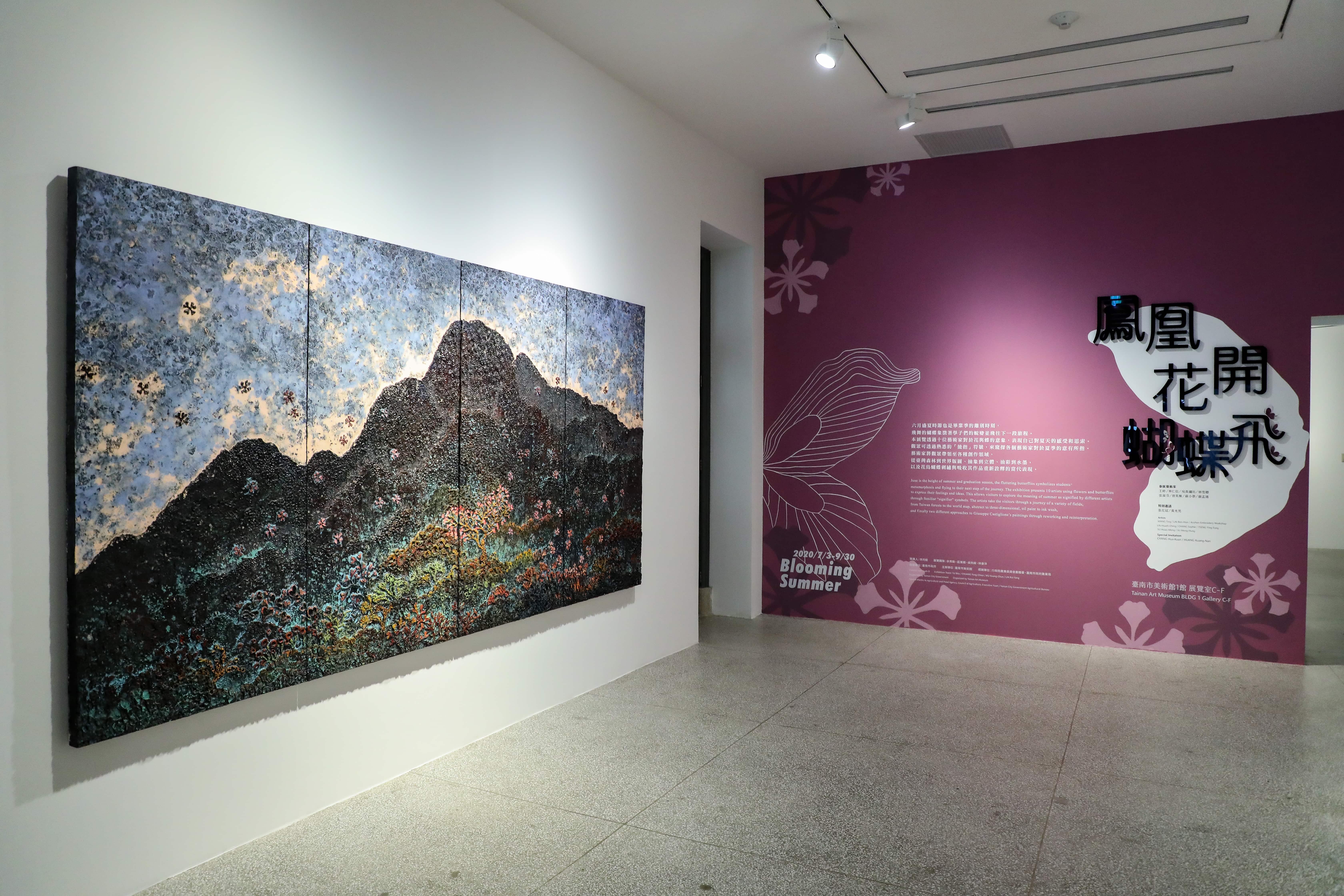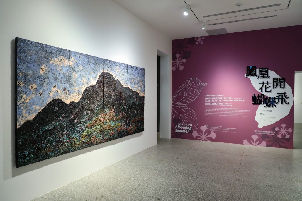 象徵畢業的臺南市花鳳凰花已在臺南街頭簇擁盛開,南美館也同時規劃「鳳凰花開 蝴蝶飛」展覽,猶如夏日百花盛開的美景,同時為臺南市美術館副館長與策展人的李月娥為我們介紹到:「本次展覽結合各種媒材的十位藝術家共同參展。臺南在地的藝術家如曾英棟老師、蘇小夢老師展以花與山脈表現出對夏日的觀察與情感抒發;林雪卿老師與林仁信老師兩位代表不同世代的版畫創作者,分別以蝴蝶為元素創作出屬於自己的藝術世界觀。此展本次獲邱再興文教基金會的大力支持,出借邱再興先生長期收藏、仿郎世寧畫作花鳥冊頁的花鳥蝴蝶刺繡共襄盛舉。為展現古今對照,耿畫廊則提供當代藝術家蘇孟鴻吸取郎世寧風格元素,以當代手法重新呈現的創作。兩組作品同場爭艷,古今對比欣賞,可說是本次展覽的一大特色。」