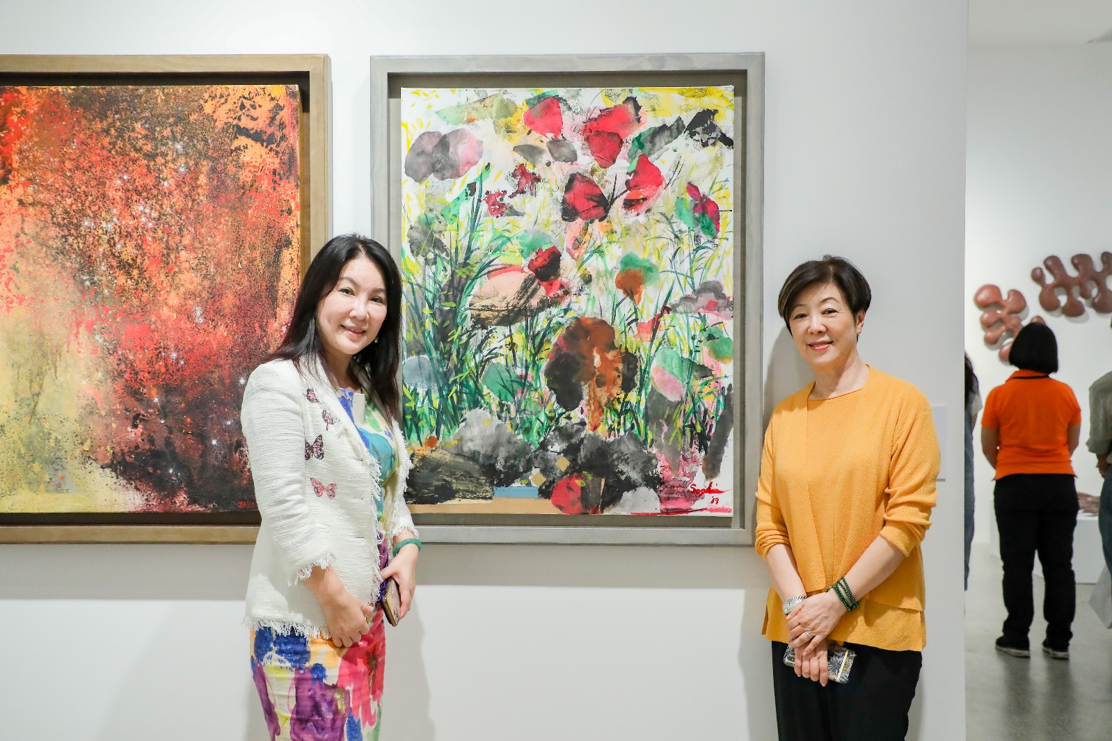 張淑芬送APEC領袖蝴蝶瓷盤,畫作在南美館獨家首展,並與李月娥副館長於展覽間內合影。