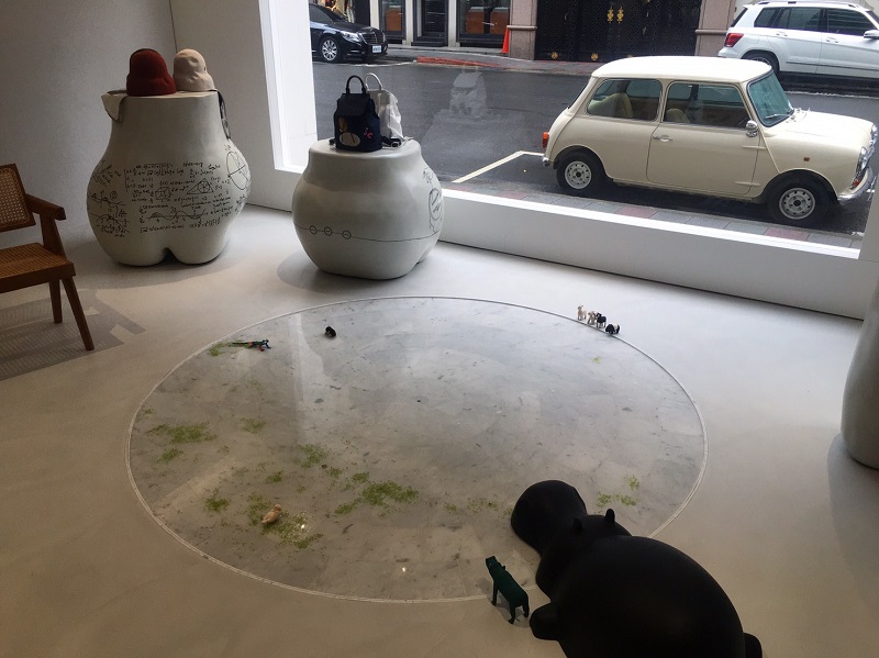 畫廊般的展示空間中處處可見藝術性裝置,連停在店外的轎車和滿載花草盆栽的卡車都是視覺造景的一部份。概念展演空間地面一處玻璃打造的池塘藝術造景中,有浮萍,有動物,在觀看者從上俯瞰時,自身也與其容為一體,象徵人類與自然和諧相處的理想畫面,童趣的動物擺件同時呼應著JAMEI CHEN 2020秋冬系列「Back to Childhood回到童年」。