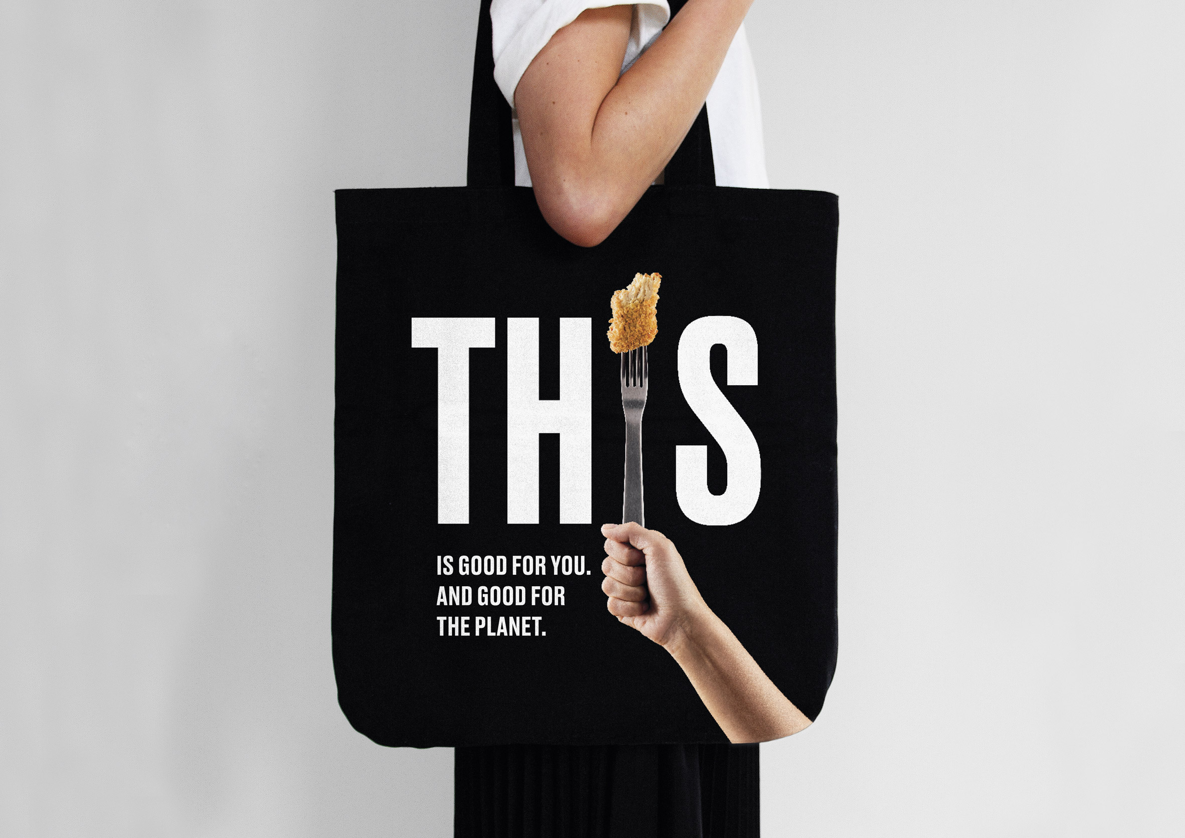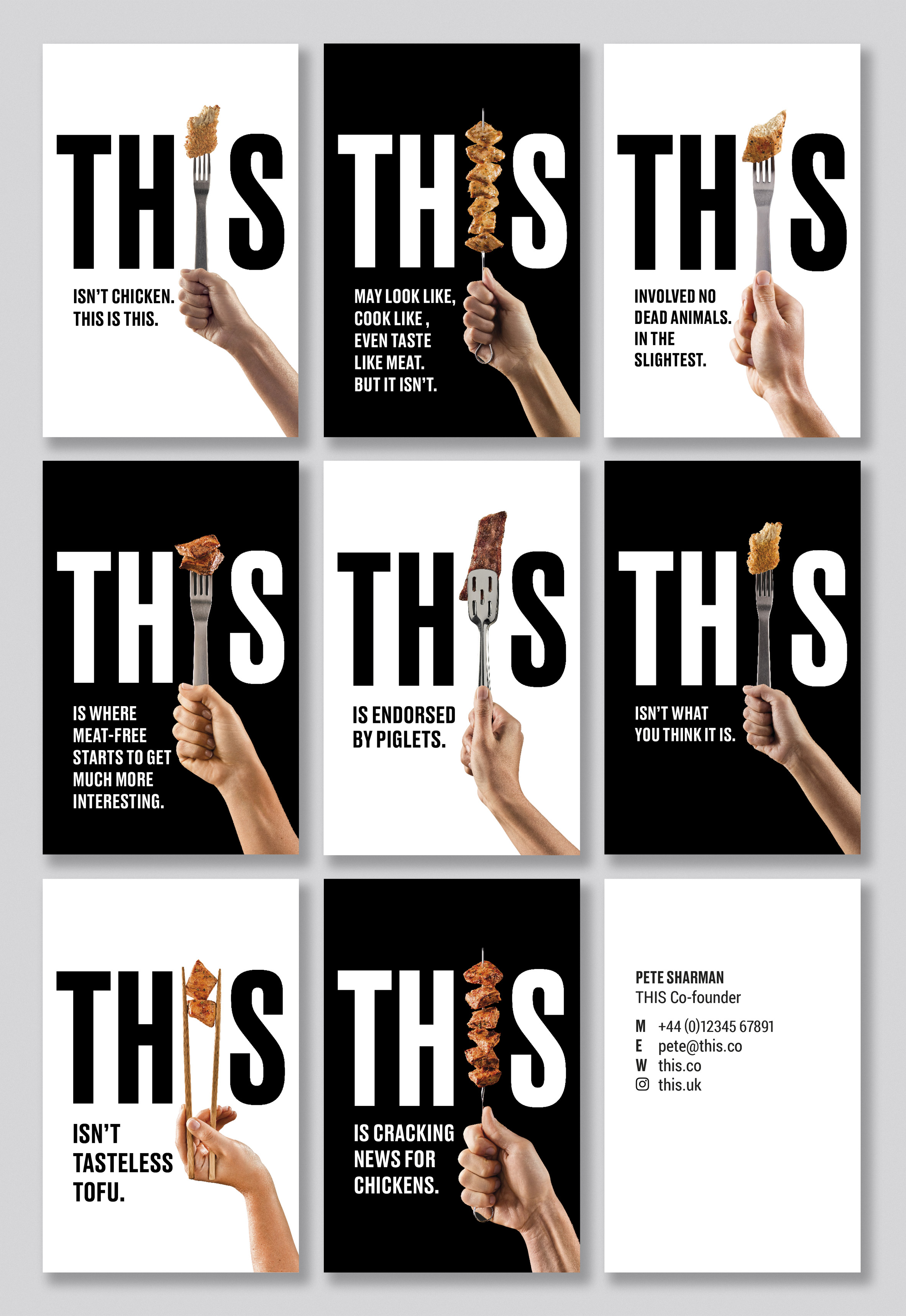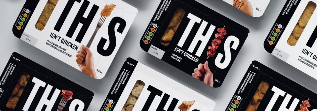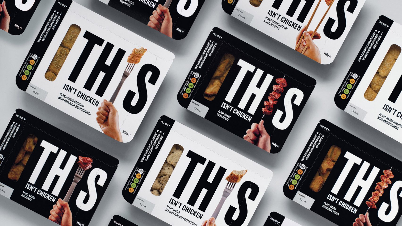 大膽搶眼的黑白外包裝,八種包裝設計中的每一款都有叉子、刀子或筷子取代在This中的「I」,一旁以短標註記「不是雞,不是您認為的」,故意裸露的肉樣也讓產品一目了然,設計工作室表示,「他們不想讓人們改變飲食,而是通過利用不可抗拒的培根氣味和令人滿意的雞肉質感誘惑人們。」此產品將於年底在英國上市。