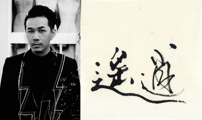 三度參與《讀衣》的詹朴,認為跨界合作就是一種教學相長:「一直在學習對藝術的理解,過程中我們亦邀請老師一起學習更多服裝的應用,因明白老師初衷,就是希望更多人感受到水墨線條之美,即便我們(設計師)在某個轉折上暫停了,還有人會繼續下去。」每一次總是挾帶巨大能量的他,此次借『湍流』對應『至大無外』,既反應了詹朴對時間議題的情有獨鍾,亦從『湍流』看到對時代變化的心境。運用緹花或印花、針織或梭織等不同織品技法來訴說關於『湍流』的狀態,並詮釋董老師所寫『湍流』線條的轉折、弧線、力道、濃淡,透過織品的排列組合,保留服裝上線條分佈的呼吸感,讓人感受到文字的波動。
