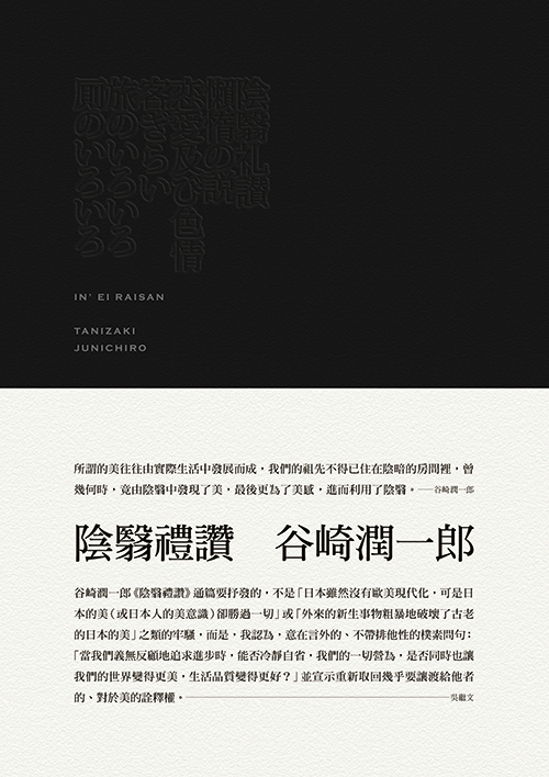 書裡強調的是,日本美學中幽暗裡的變化,其實是所有創造力集中的所在。與西方美學不同,西方是在太陽照射之下所顯現出的美學,所以強調形體、比例與細部,但是陰暗的美學是強調幽暗中的朦朧所創造出的想像力,說的是氣氛。例如書中例子提到,西方教堂皆設計透明窗為使日光能大量的照進室內空間,所以在明亮的環境中細部設計就很重要;但是在東方的廟宇中,斗拱上是非常陰暗的,卻擺上身漆金色顏料的佛像,當你點燃蠟燭時,突然看到那些暗部全成了立體的模樣,一點點的燈光反射就能夠造成巨大的視覺氣氛!在這本書中可以看到美學之於東方人與西方人的不同,在裡頭都有非常生動的詮釋。