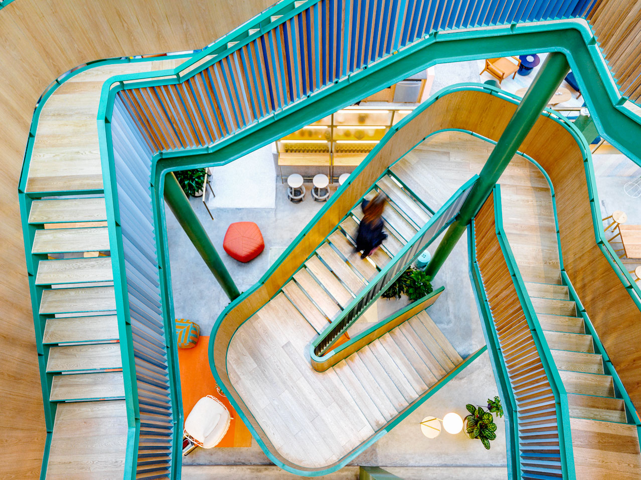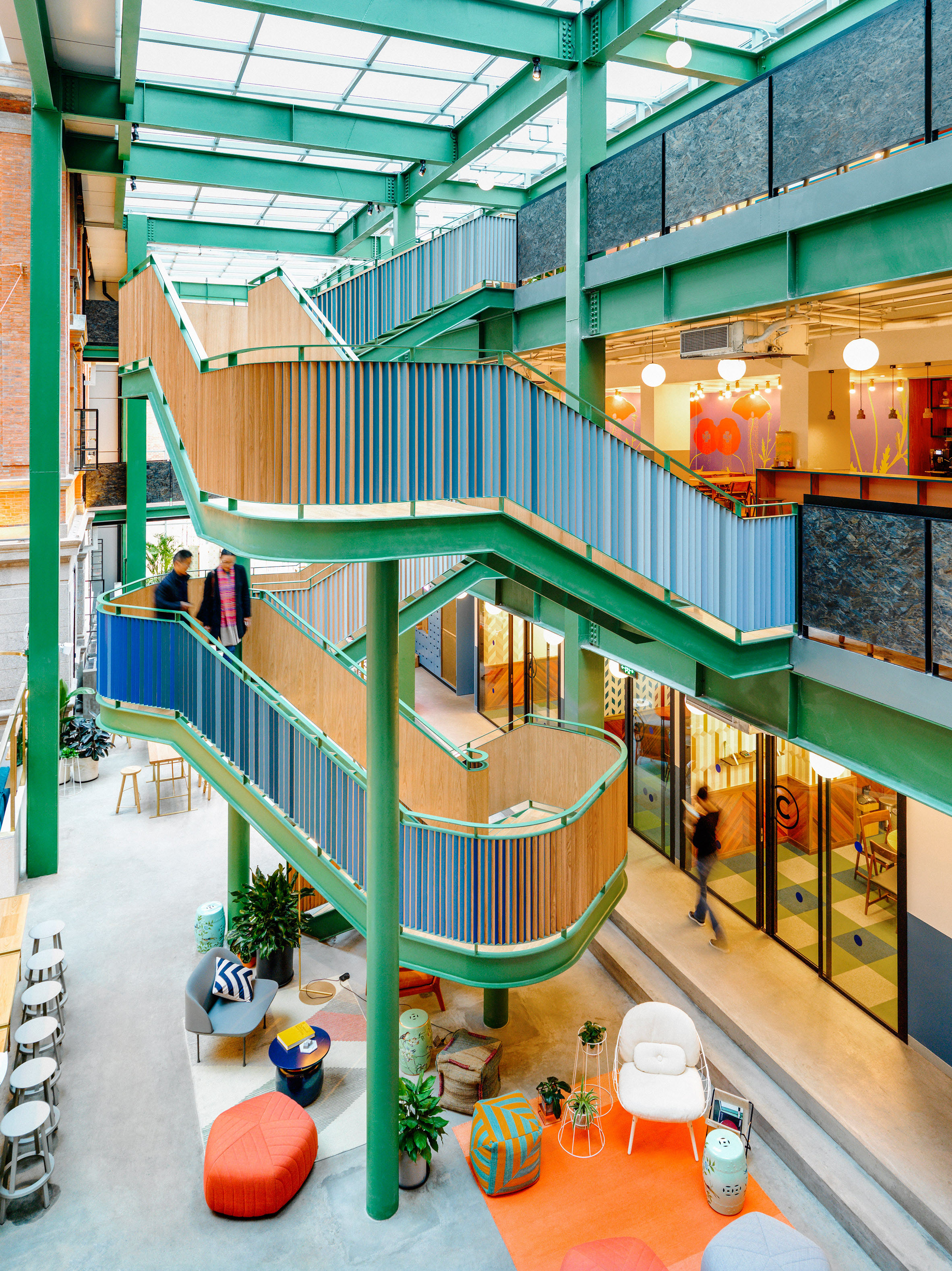 U形紅磚建築圍出一塊天井區,提供開放的平面共作空間、酒吧使用。一側重新粉刷結構鋼架和迴型階梯,以鮮明的常春藤綠色和紅磚牆、灰面壁坪形成對比,讓富有歷史感的空間萌發新創的朝氣。連結三層樓的樓梯以木色調和深淺不同的藍色形成漸層效果,像極裝置藝術般的樓梯在老建築中立刻抓住眾人眼球,成為點睛設計。