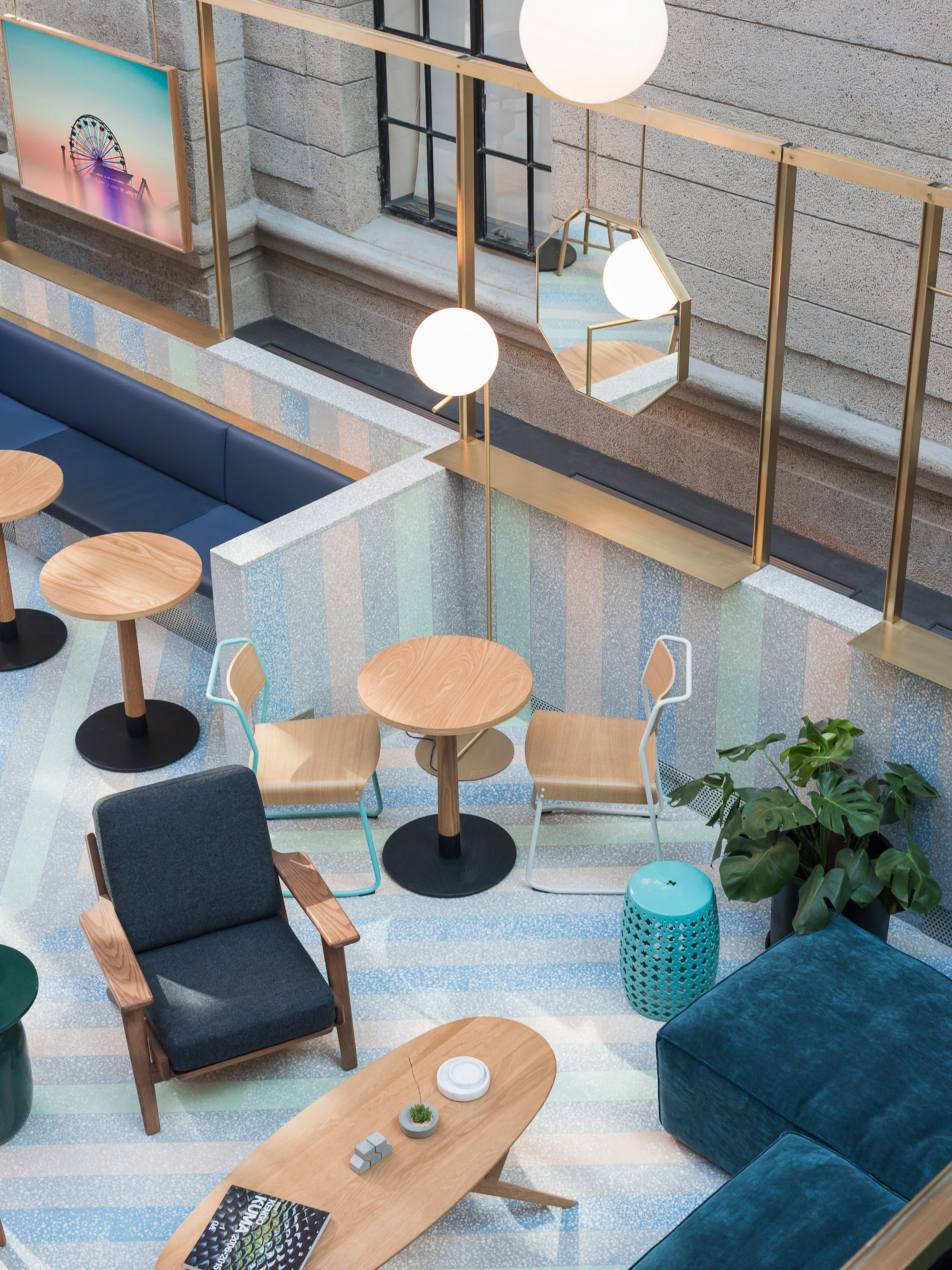 天井區結合飲食和工作的區域,以水磨石矮牆介分使用屬性。斜條狀的粉蠟筆色調從矮牆延伸至壁坪,使冷硬的空間充滿柔和舒適的氛圍。此區有較為休閒的多人沙發區、長椅和個人桌組成的單人座位區,以及可供討論使用的長木桌區,周圍飾有金色框架和懸掛的鏡子、畫作,圍塑閃耀著光澤和人文氣息的場域。