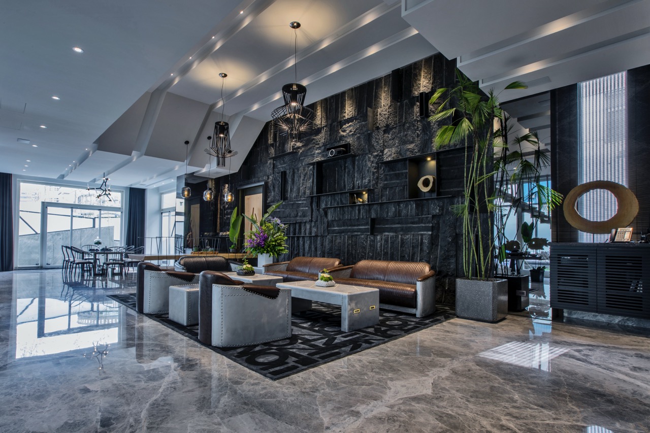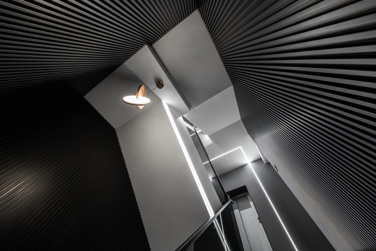 一樓寬敞開闊的大廳與餐廚區,擁有獨特的局部天頂挑高設計,穿插線性燈溝的摺曲延展,導引自由無邊的仰角視野,光潤的大理石地坪則與玻璃帷幕外的豐饒四季相互輝映。沙發背牆運用縱橫交錯的大量黑色花崗石皮鋪陳,搭配嵌入的鐵件線條形塑力與美,既勾摩出大山樣貌,亦營造磅礡恢弘的迎賓氣勢。公領域的家具擺設採用「陣列佈局」,藉由美式鋁皮沙發、特製原木厚剖長桌、中式改良版的鐵件圈椅等,突顯高反差的個性主張,並使用灰鏡、黑鏡等材質為主面材,盡顯優雅大方。