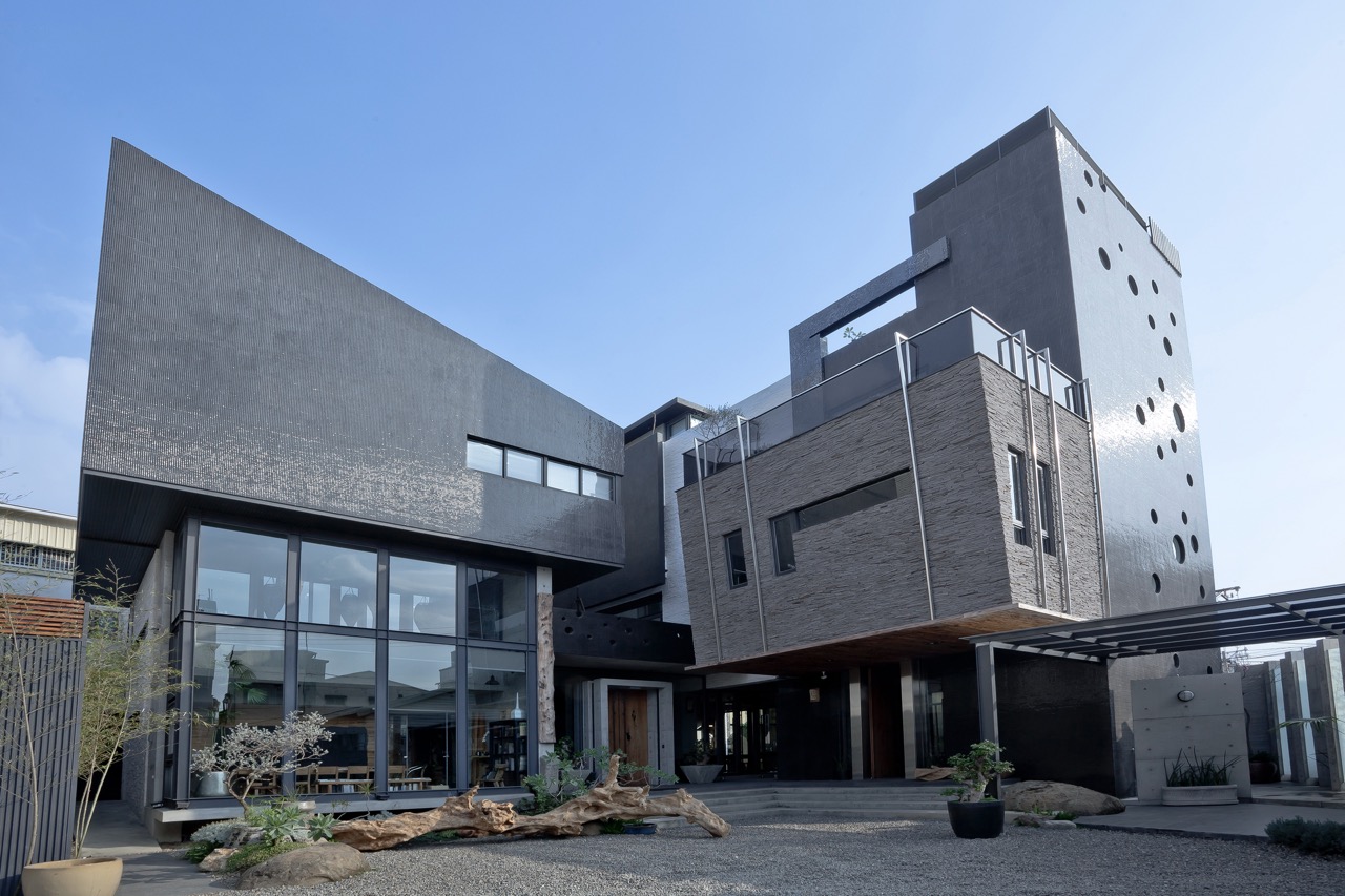 建築外觀以高低錯落的方盒堆疊之構思,輔借簡潔俐落的水平、垂直線條解構層次,加上白色岩片、清水模、格柵及計畫性的不規則開口,形構新穎有趣的當代美學設計;圍牆則巧用鐵件及玻璃,描摹富含層次的山稜線,回應與自然和諧共生的主軸。