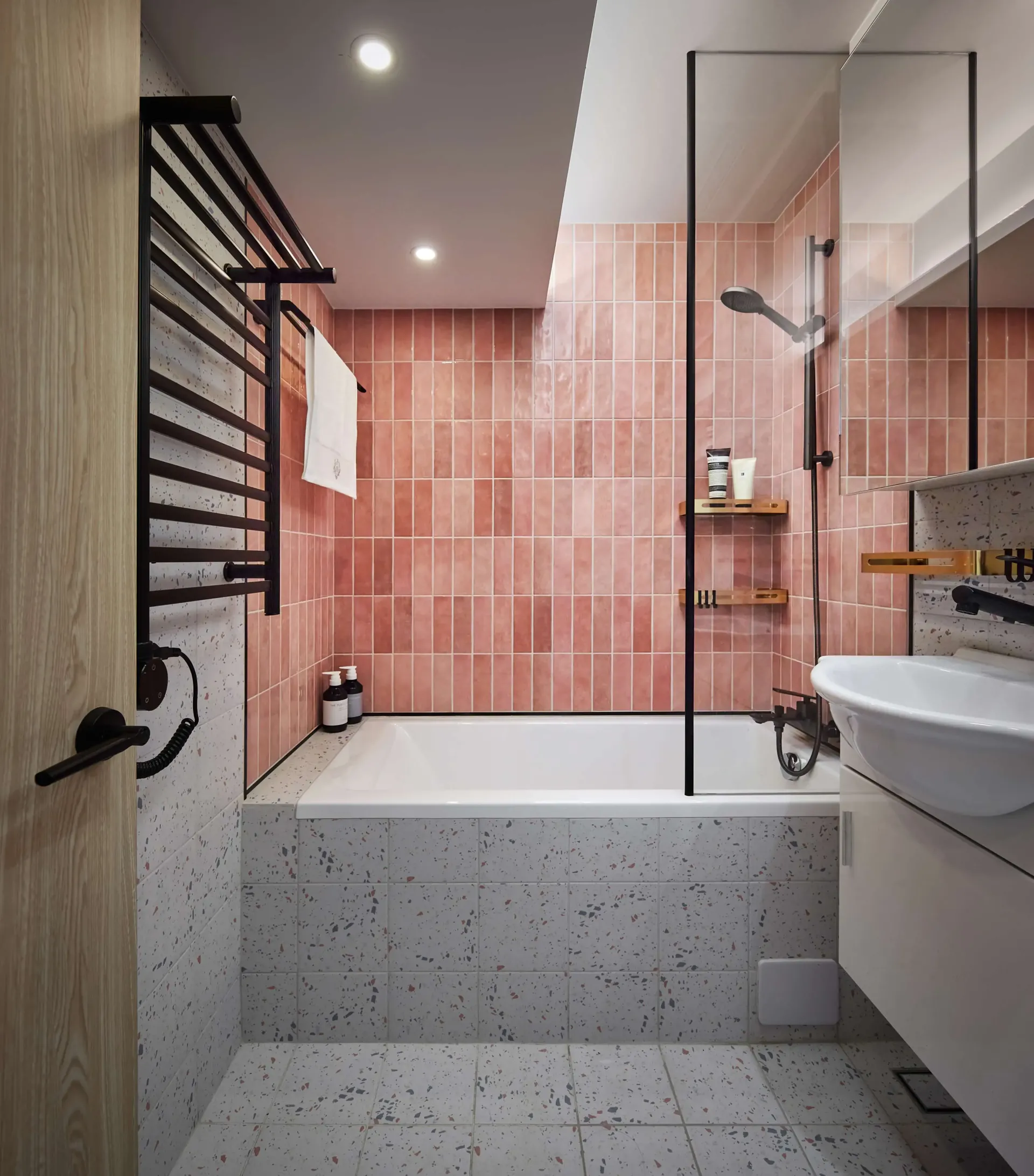 以住家來說,可能是一個空間或是一個軟件或是一個家具,一點點的粉紅色就足以詮釋這個空間了,因為通常家裡不是只有一個人住,那麼「平衡」這件事情就變得格外重要,要怎麼去包容其他人喜歡的東西,同時在空間裡面完整的呈現又不會太突兀。鄧湘盈說,如果我們遇到的業主特別喜歡粉紅色,我們可能會把它應用在櫃體或牆面上,並綜合其他的顏色,如果想要明亮的效果,也會使用釉面的磁磚,並提昇空間的質感。