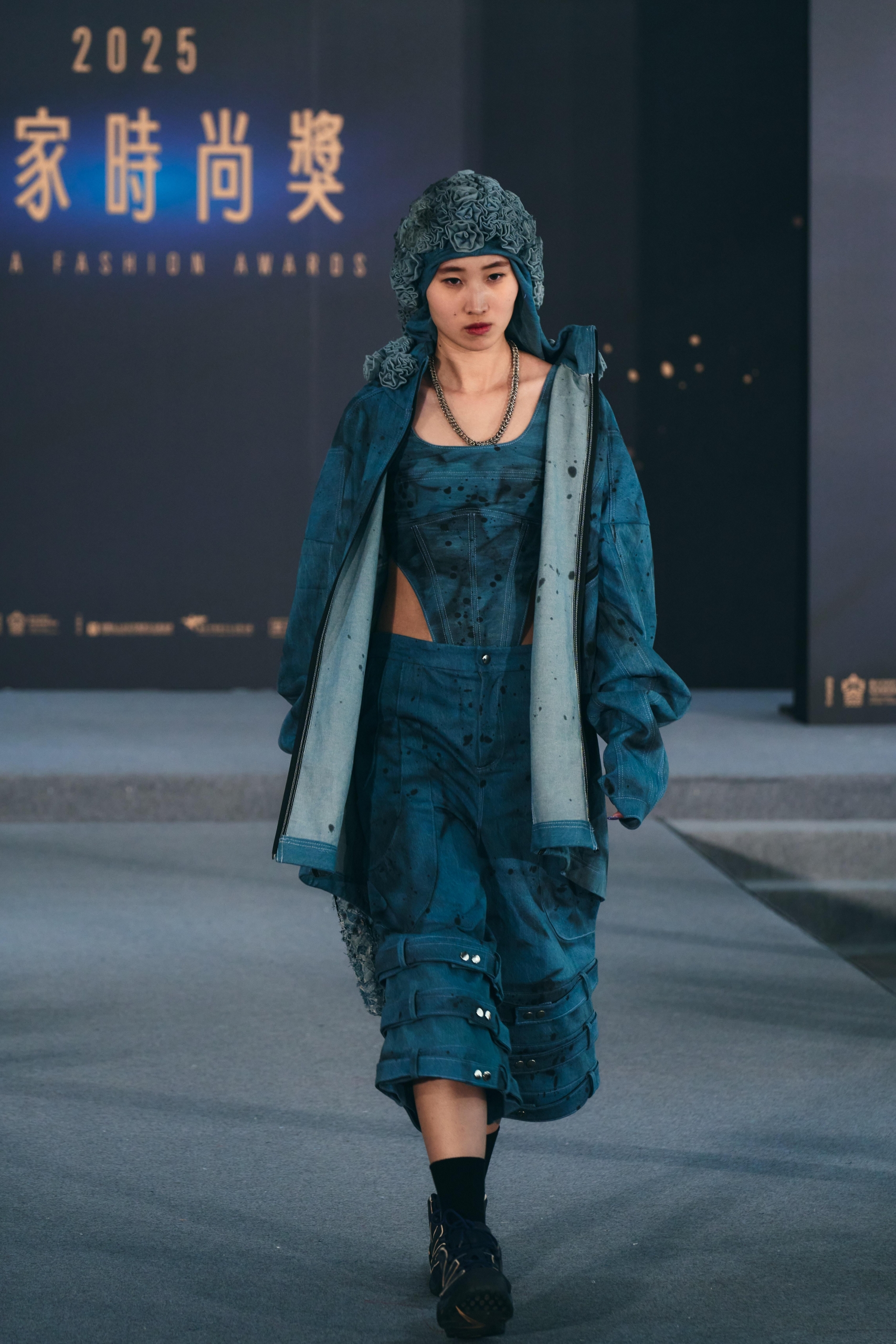 在設計之初,歐修維便鎖定「藍染」作為切入點。他回憶,大學時期曾修過相關課程,對這項工藝產生興趣;而在比賽籌備階段,他進一步查找資料,並將「藍染」兩字拆開解讀——「藍」對應他選用的丹寧布料色彩,「染」則轉化為噴漆塗鴉技法。透過這樣的重新詮釋,藍染從傳統工藝轉換為一種跨越世代的時尚語言。