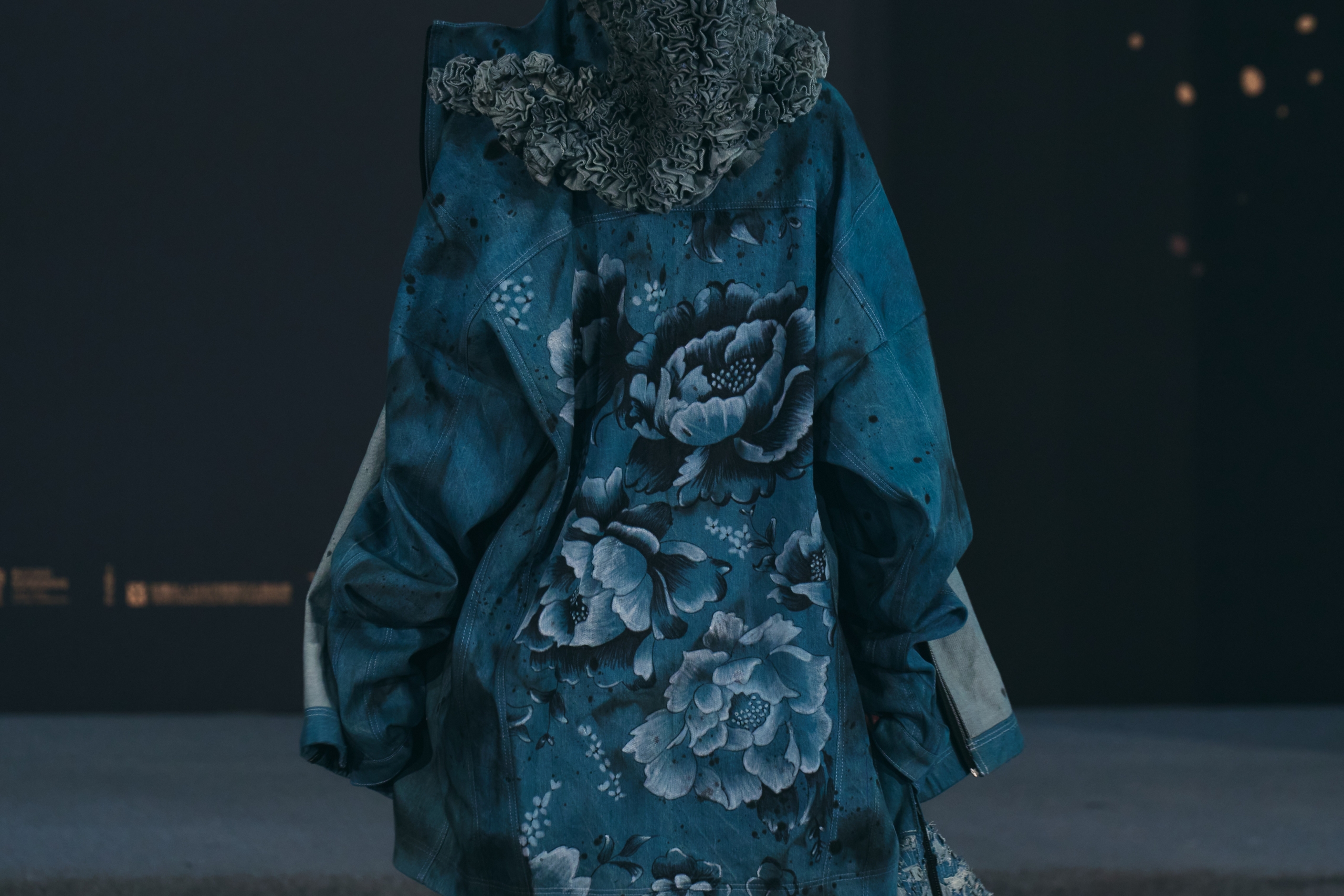 《Blue Roots》把客家藍染穿進街頭,成為時尚的另一種宣言。藍染對應丹寧的藍,塗鴉成為另一種「染」,百朵手縫布花承載了時間與記憶的重量。歐修維用他對客家藍染的再詮釋,把傳統精神轉化為能穿在身上的當代語言,也為新一代設計師如何與文化對話,提供了一個鮮明的範例。