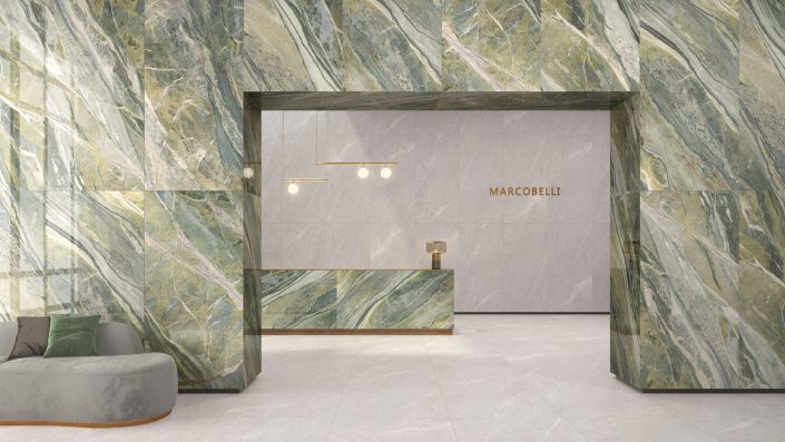 如現在許多飯店、住宅大樓、商業空間等,從接待處到室內,其實對磁磚的空間運用來說非常龐大,不同於以大理石打造的空間,磁磚的施工與對不同空間的需求,更具靈活度。完整石材或許在呈現大面積空間來講,具有張揚的美感,但「瓷藝中板」亮相後,旗下的馬可貝里磁磚「星曜米蘭」系列,更將磁磚變成藝術瑰寶,運用豐富色彩感,將奢石美學結合精湛工藝融入生活中,展現雍容奢華的居住型態。
