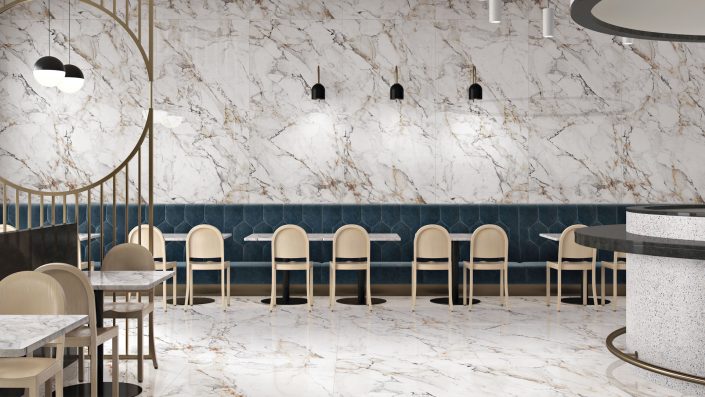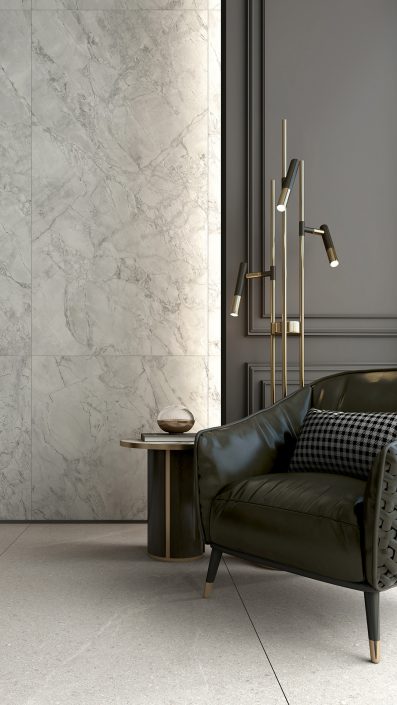 當我們訴求實用機能的同時,又想將大自然原始質感帶入室內,多數人會選用大理石磁磚做成檯面或大面積鋪貼牆地面做搭配,挹注空間絕佳的獨特魅力,從而彰顯出一種高品質的生活格調。如「星曜米蘭」系列的卡拉卡塔金,以象牙白交織出灰金紋理,不僅為空間帶來華麗感,還散發出貴氣氛圍,若搭配木質調性的家具,佐以金色、奶咖色等暖調色彩點綴裝潢,更能塑造輕奢風格與溫暖的居家生活氣息。