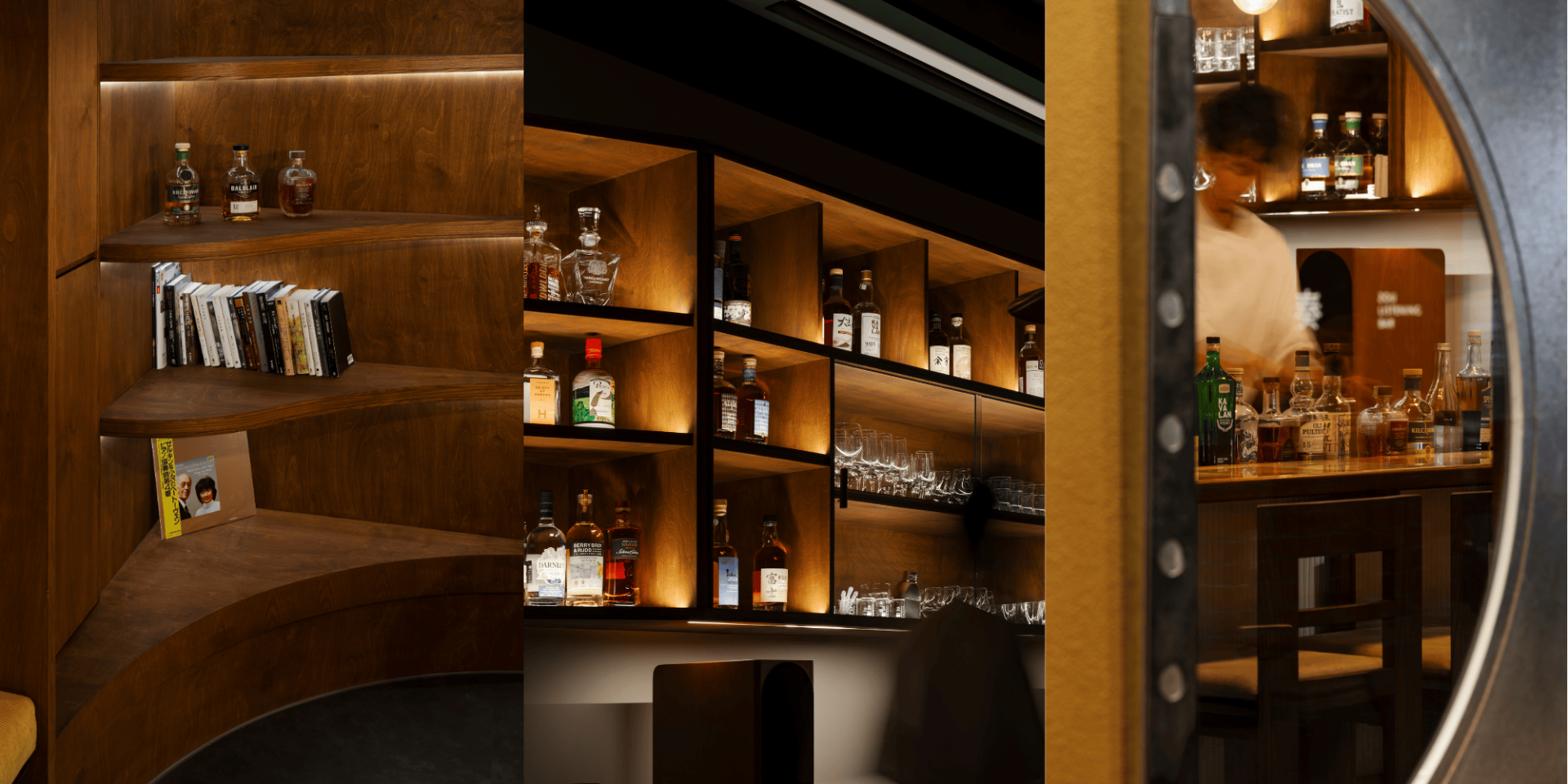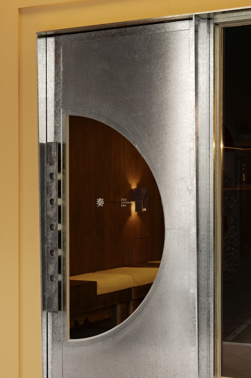 為了回應長時間停留的需求,空間內的餐椅為量身訂製,從坐深、椅背角度到包覆感皆經過多次調整。吧檯後方沿牆設置卡座區,樺木立面結合展示層架,搭配芥末黃絨布椅墊與壁燈光暈,提供另一種較為放鬆的入座方式。後門牆面的不規則幾何開窗,靈感取自「圖像記譜」,為整體空間增添現代感,也呼應音樂作為主體的設計概念。