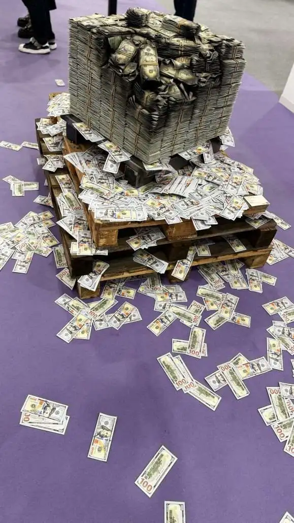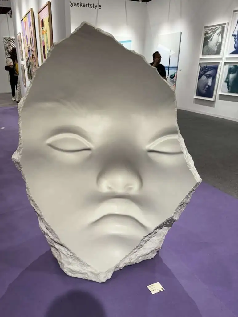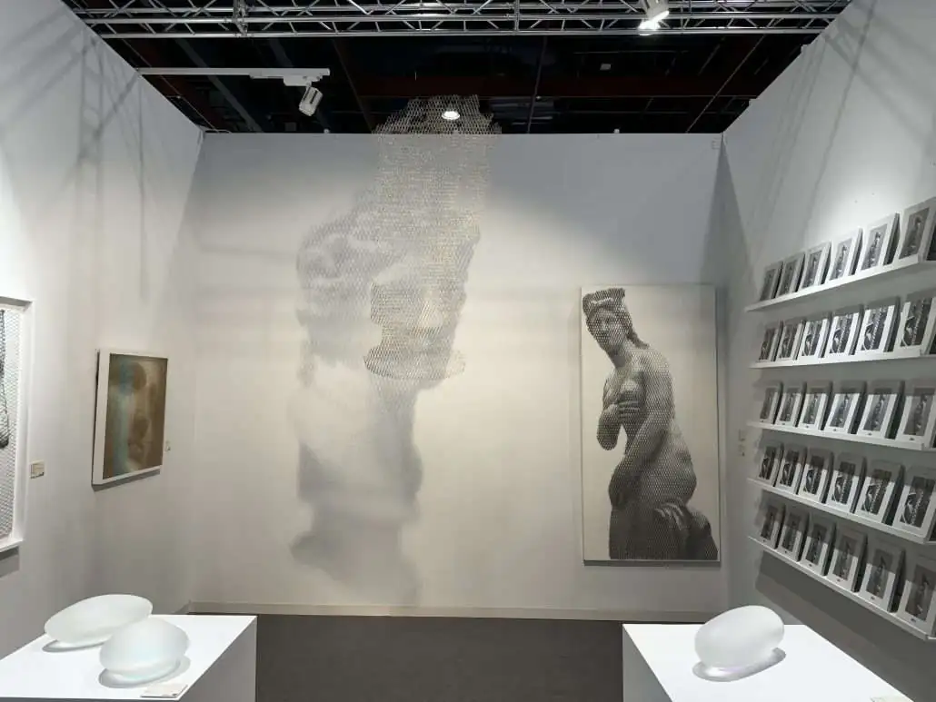 D GALLERIE,MULYANA,HARMONY49。圖片來源/DFUN。以及由丁丁藝術空間展出的由水泥、玻璃纖維等複合材料塑造而成的臉型展品、堆疊成山的紙幣藝術效果展品、懸吊的鐵網切割在光影的投射下呈現出女神像的展品,在藝術與材質的延伸性與空間張力都具有強烈的視覺效果。