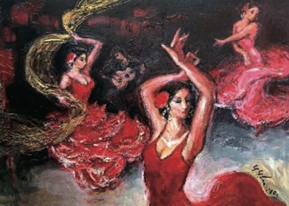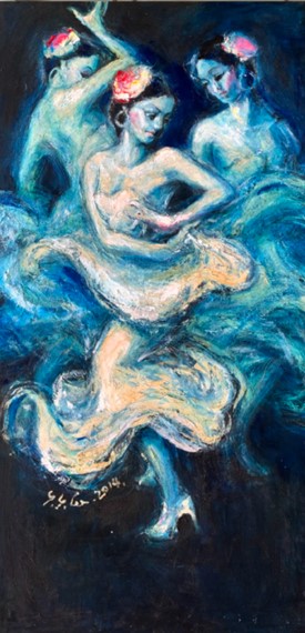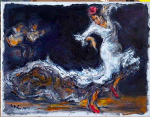 此次展出多幅的「佛朗明哥」系列藉由自由奔放的濃厚色彩,捕捉舞者專注當下、謳歌生命原力的瞬間;伴隨著吉他旋律,佛朗明哥舞者隨著切分音節,跺出明快矯捷的舞步,女舞者舉手投足間挑起靈魂深處的激情與悸動。李永裕筆下的「佛朗明哥舞者」充分展現其特有的力與美,簡潔的構圖、強烈的色彩,配上粗獷的油畫肌理與充滿張力的筆觸,將舞姿凝聚成瞬間的畫面,作品中具有渾厚深沈的音樂性,一如佛朗明哥舞蹈狂野濃烈的本質。這些作品不僅令人印象深刻,甚至被知名作家米蘭·昆德拉選作小說《可笑的愛》中文版封面。