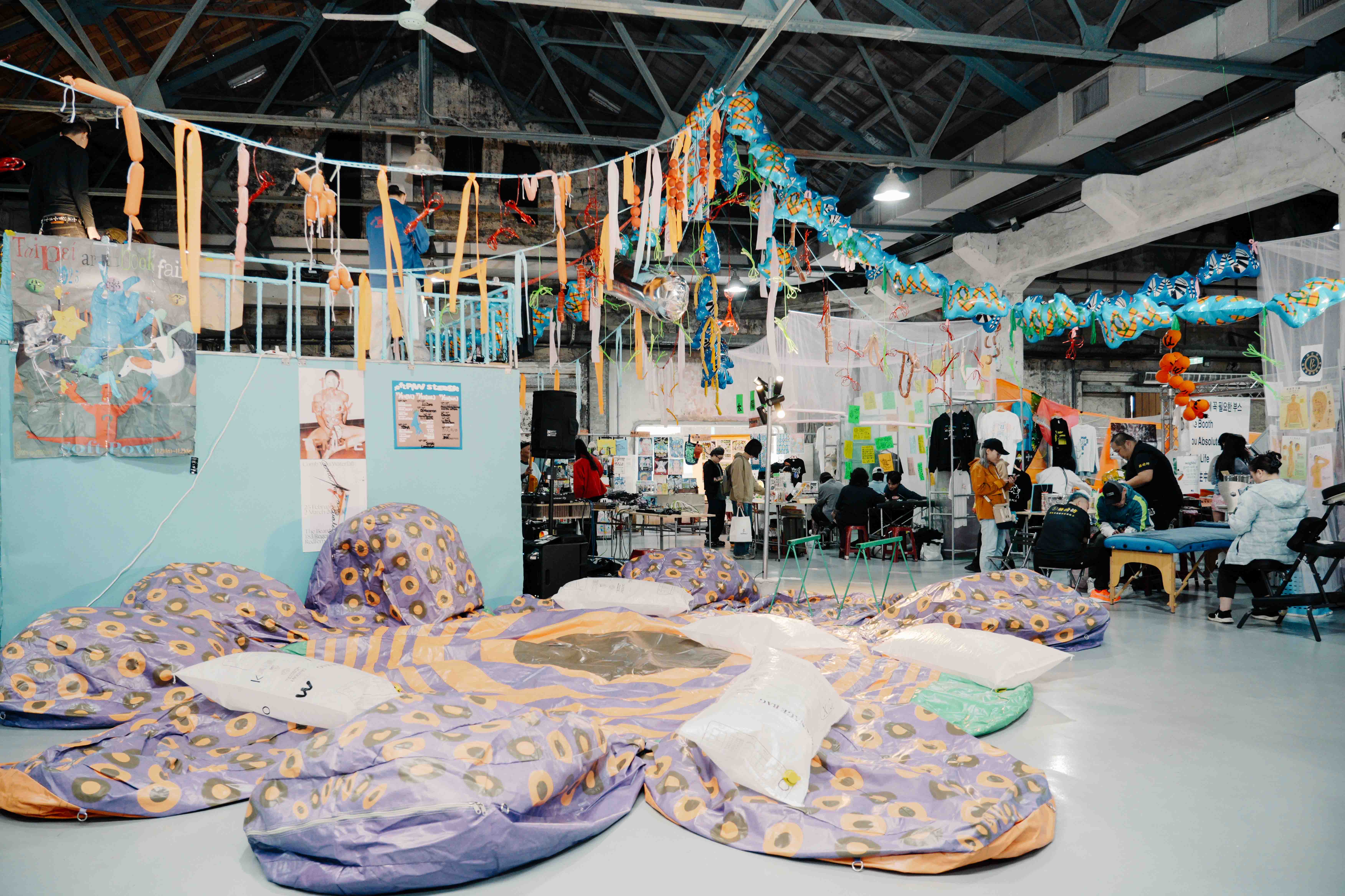 以「柔軟」作為年度語彙,策展團隊今年在現場嘗試了更多材質、光線與結構的實驗。多彩風箏布、透布包覆鋼架的方式,讓空間像是被輕輕鬆開的胸腔,觀者得以在其中找到自己的節奏。柔軟並非逃避,而是讓人能慢下來,看清創作與創作者之間的距離。這樣的策展語言也與今年的世界情緒薄膜相契合──摩擦、躁動、轉換都需要一個足夠溫和的地方安放,草率季恰好成為那個容器。