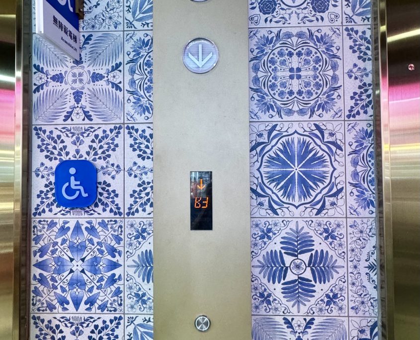 市場外觀以沈穩的色調與白色招牌呼應,一入門的手扶梯與空間挑高的感覺,讓人感受不到是走近菜市場的感覺。電梯間的設計更有臺灣美學花磚與玫瑰金質感的電梯相呼應,而整體的攤商的招牌也都重新設計,更具創新及統一性。