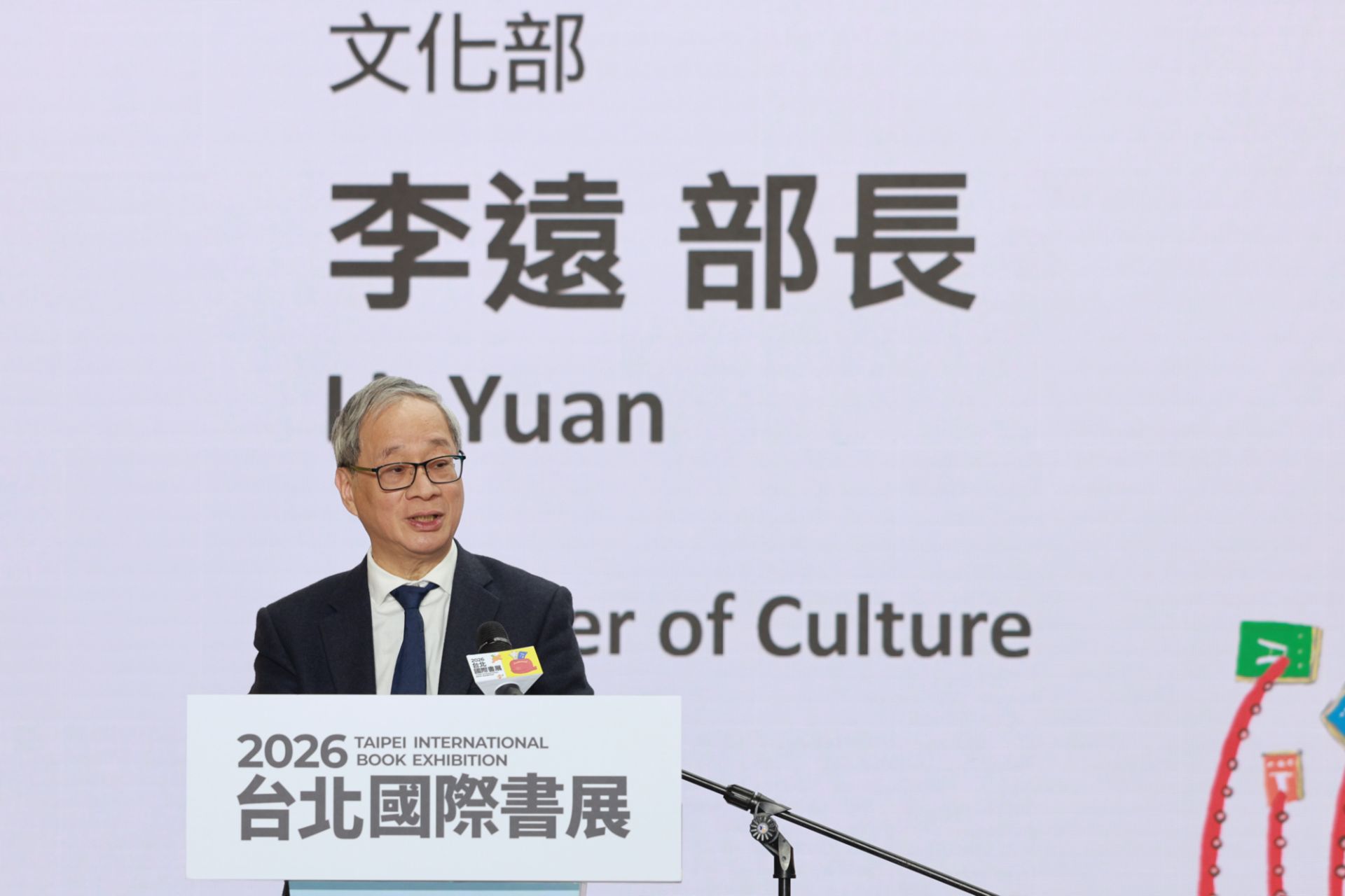 文化部長李遠於開幕式致詞。李遠指出,臺北國際書展不僅引進世界優秀作品,更是臺灣文學與漫畫走向國際的重要窗口。