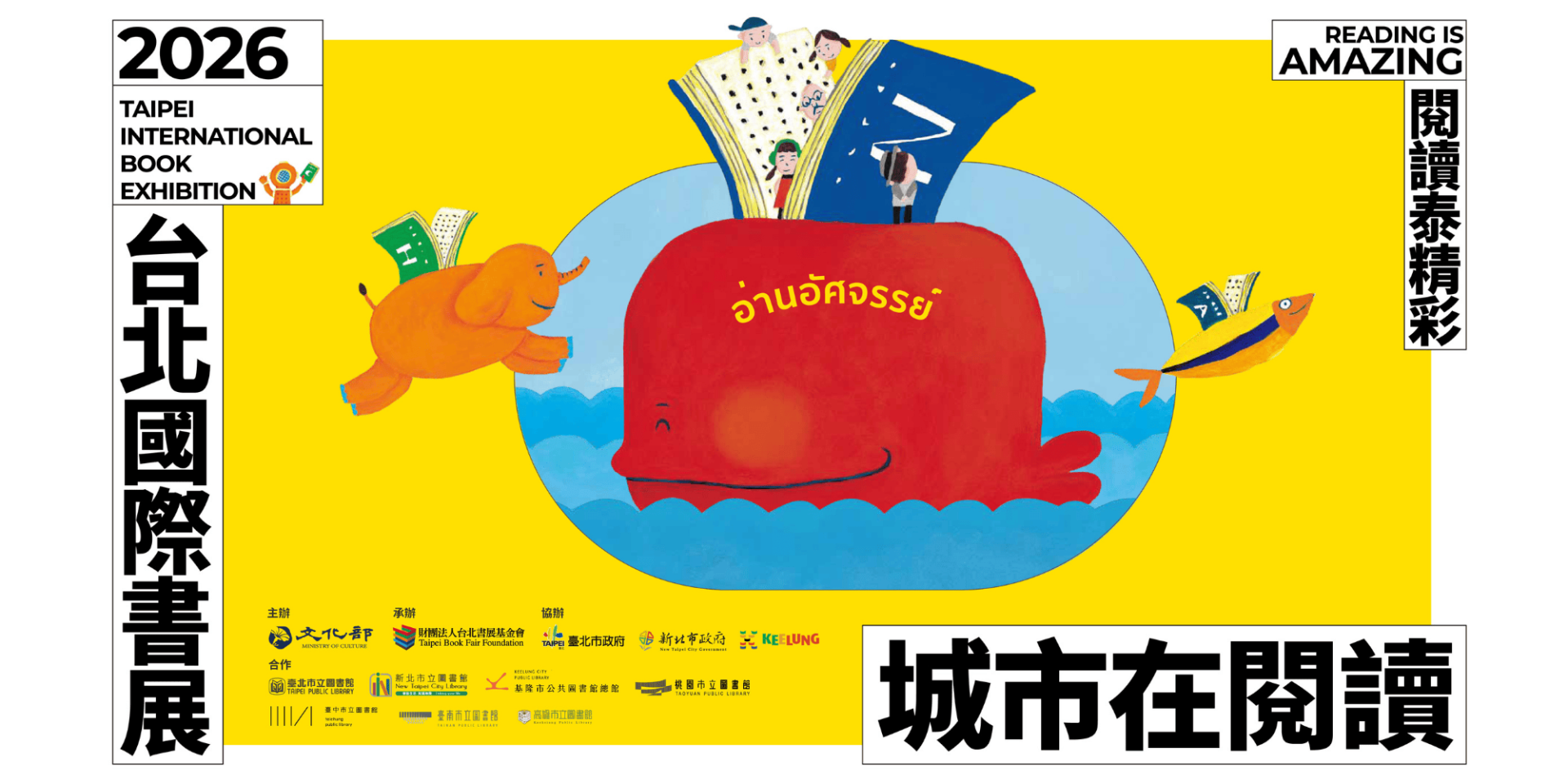海報設計特別將英文標語「READING IS AMAZING」加上泰文翻譯,並搭配飛翔的大象,精確傳達主題國泰國的文化語境。繪本作家黃郁欽曾入選波隆那插畫獎並榮獲金鼎獎,陶樂蒂則曾獲陳國政兒童文學獎首獎,兩位創作者透過熱鬧繽紛的畫面,呈現閱讀無所不在的可能與驚喜。