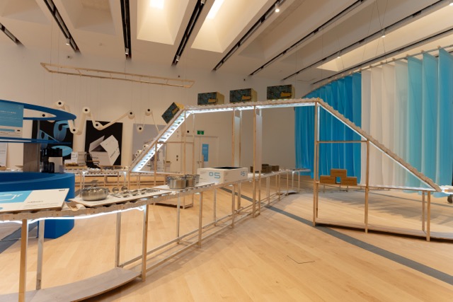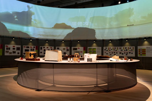 而位於左側的「透新北」展區,以「透」為該展區的畫筆,勾勒新北在地的想像面積,以同心圓的方式向外或向內的擴散與沉澱。在最外層能看到一圈以漸層藍色圈形組合,靈感來自山跟海的意象,由新北的驕傲儒鴻企業所研發的透氣機能布料,製作近270條的巨型布幔組成的展品,民眾也能親自觸摸與穿透到另一處的展場往下觀展的「透」的概念。走進展場後會看到許多紙材與複合材料,茶葉、肥皂、鉛筆….等都是「透新北」想傳達的一種概念,在大河之城的生活圈,遇見為生活帶來想像的產業之秀,也在各式配方裡透見對生活的想望。