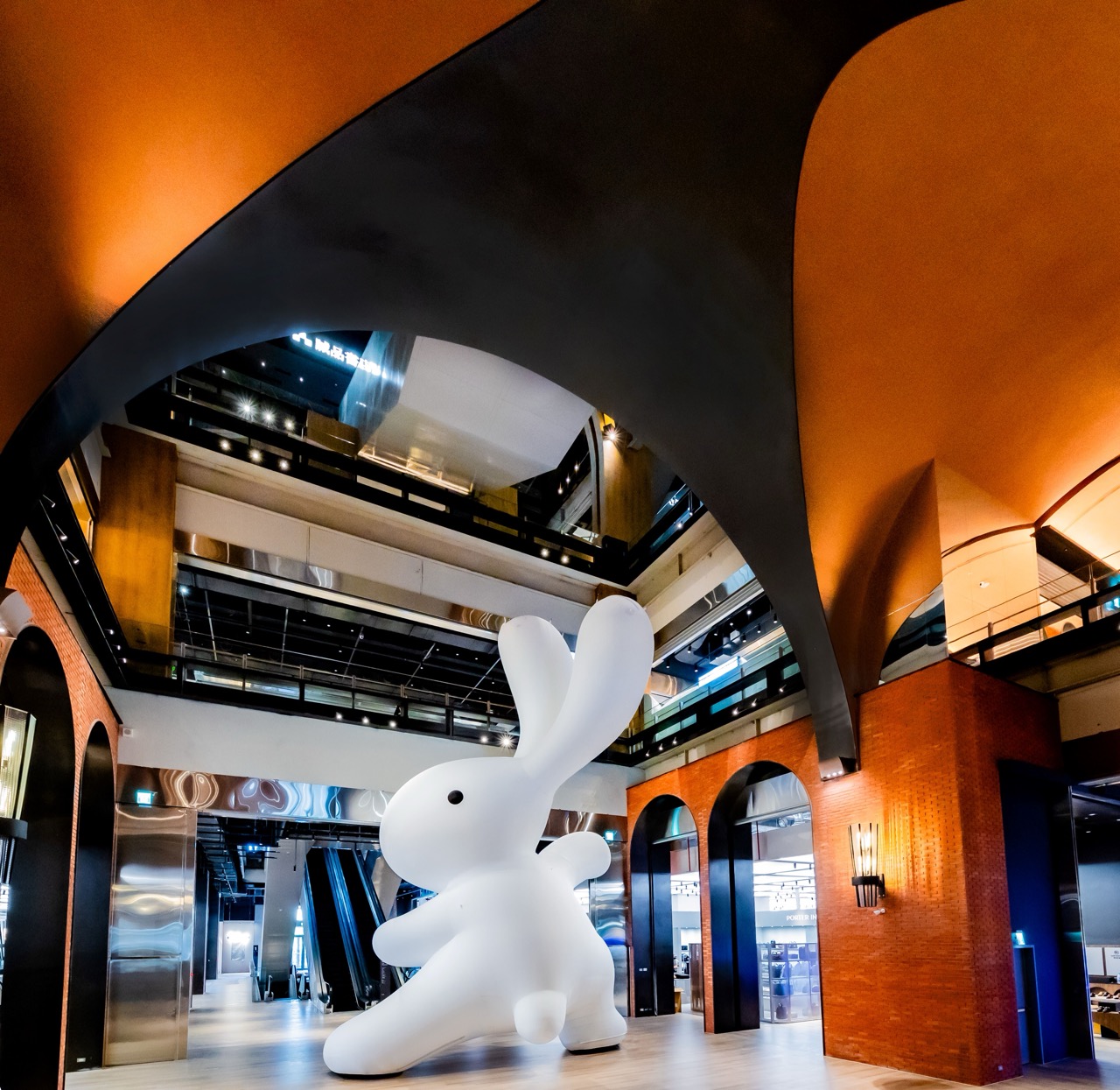 誠品生活新店|由知名藝術家黃本蕊創作的10米高巨型兔子「太極尼尼」藝術裝置在一樓迎賓。圖片來源/誠品生活。