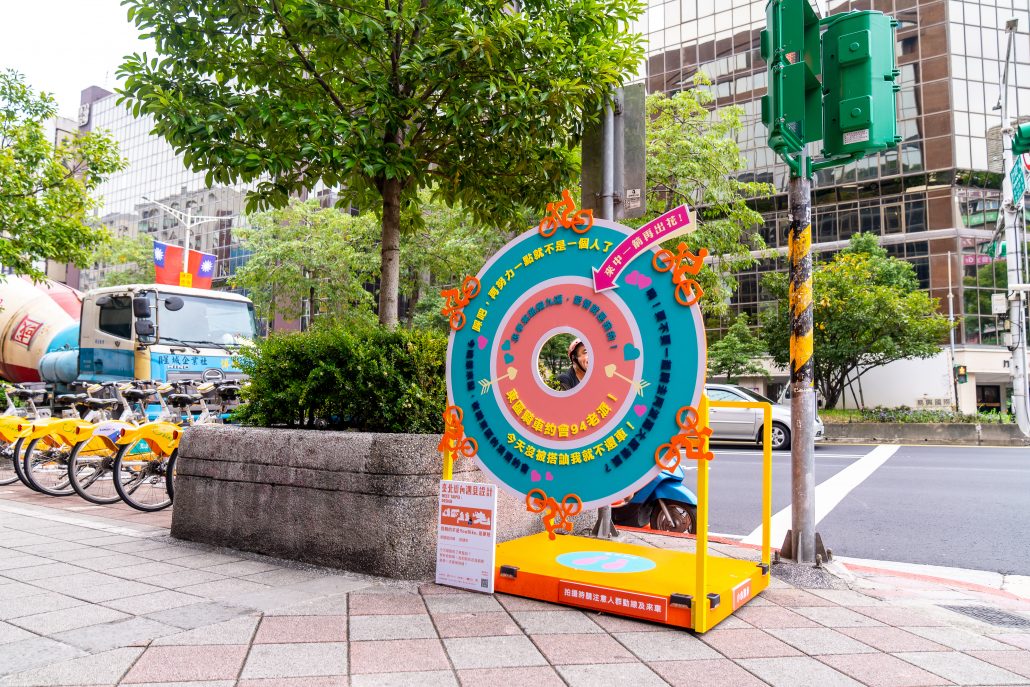 人們來到東區,除了是踩下踏板、逼自己撐下去的上班通勤,也可能是充滿粉紅泡泡的社交約會。將兩種東區情境,化作共享單車站的趣味裝置。藉著幽默的情境置換,在平凡日常中,妝點一天的旅程。