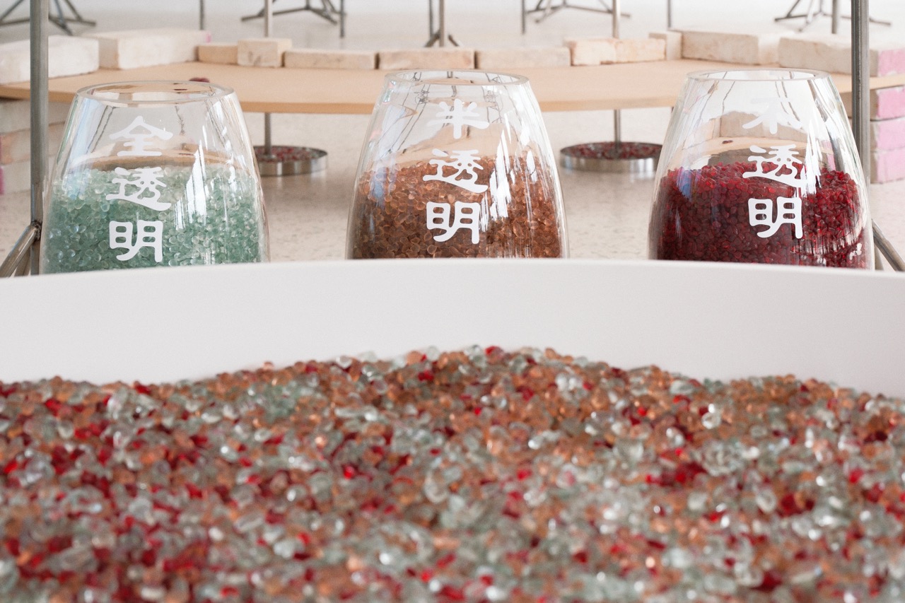 「廟仔」一詞在台式生活語彙中,意指地方社會中小型且親近的信仰場域。展覽藉由降低廟宇的威嚴感,讓「透明」成為一種親切且易於接觸的狀態,邀請大眾走進並感受廢棄玻璃煥然一新的多式樣態。展場設計巧妙融入玻璃製程器具,例如將玻璃塑形使用的吹管支撐架轉化為展架,主視覺色彩則取材自玻璃窯爐材料「莫來石」長期高溫燒製呈現的淡粉紅色。