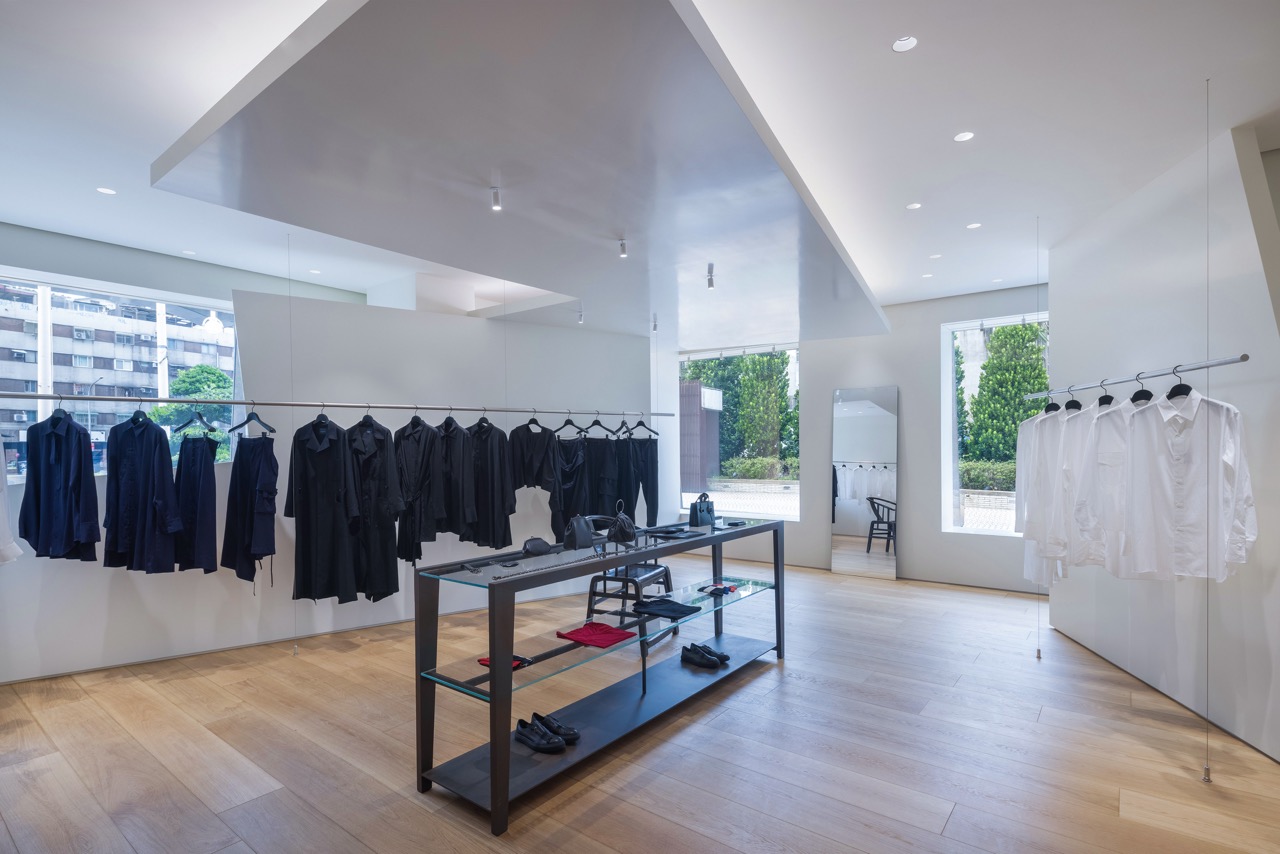 空間內,可以看到許多大面積的白色斜切牆面,不規則的散落在空間內,其中的意向也如同山本耀司服裝中多層次又飄逸的設計風格。三個品牌沒有明確或刻意的透過牆面分割出品牌,讓品牌與品牌之間巧妙地融合,同時也透過這些斜切的牆面,形成了一種靜謐感。在這個空間中,設計師希望營造出「服裝不斷的出現著」的綿延氛圍,時而以局部的方式展現,時而呈現一字排開的霸氣感,隨著在店舖空間內穿梭,呈現不同的視覺樣貌.