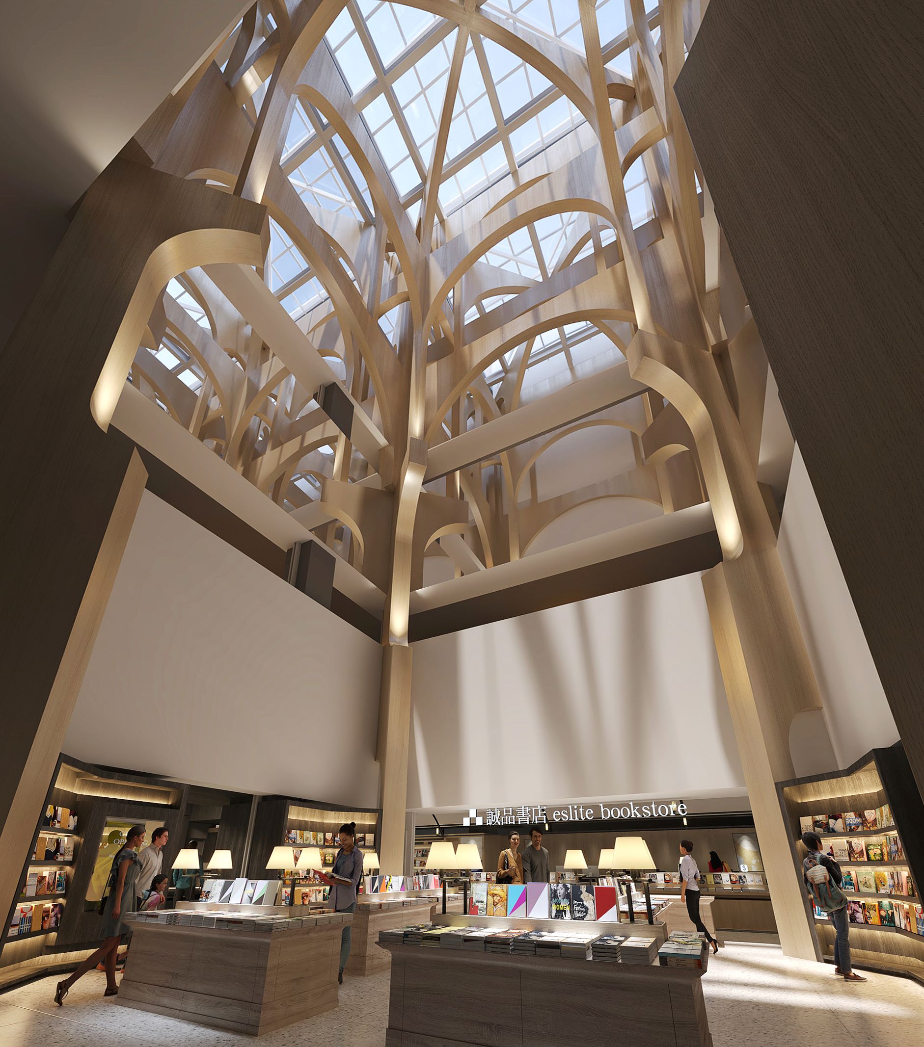 將「誠品生活新店」打造成一座偌大的立體城市,正中央以十字軸設計公共街道,並透過一連串的巨型拱門象徵橋樑連結B1至4F,打造一條朝聖之道;搭乘手扶梯一路穿越沉著的紅磚、輕巧的木質感受空間氛圍的細膩轉換,最終抵達朝聖終點4F書店閱讀殿堂。穿越入口兩側歐式古典櫥窗,迎面而來的是穿透5層樓、挑高達30米的天井,能隨著不同時間的光影變化,沉浸體驗與眾不同的光合閱讀;書店中心則以長達50米的閱讀大道貫穿,錯落著閱讀充電座位,讓讀者可以在書香中穿梭休憩。
