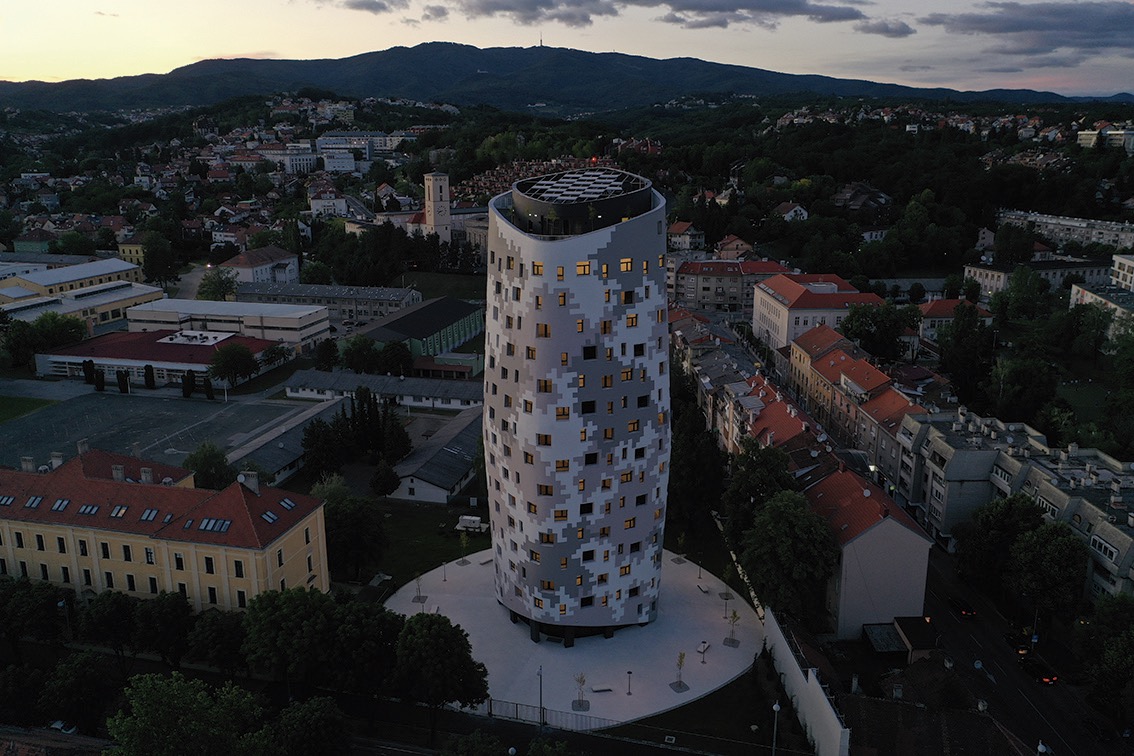 位於薩格勒布市中心 Ilica 大街的 MOR(p)H,是為克羅埃西亞軍事學院所打造的住宿設施,也是城市天際線中辨識度極高的高層量體。面對周邊歷史主義軍事建築的強烈語境,PROARH 選擇以對比策略回應環境,外立面採用軍事像素化圖案,使建築在缺乏可參照語彙的情況下,從自身功能找到形式上的正當性。其立面以連續的外皮處理避免開窗節奏造成的混亂,使整體更具一致性與識別度,呈現出 PROARH 一貫以創新語言處理複雜背景的建築手法。