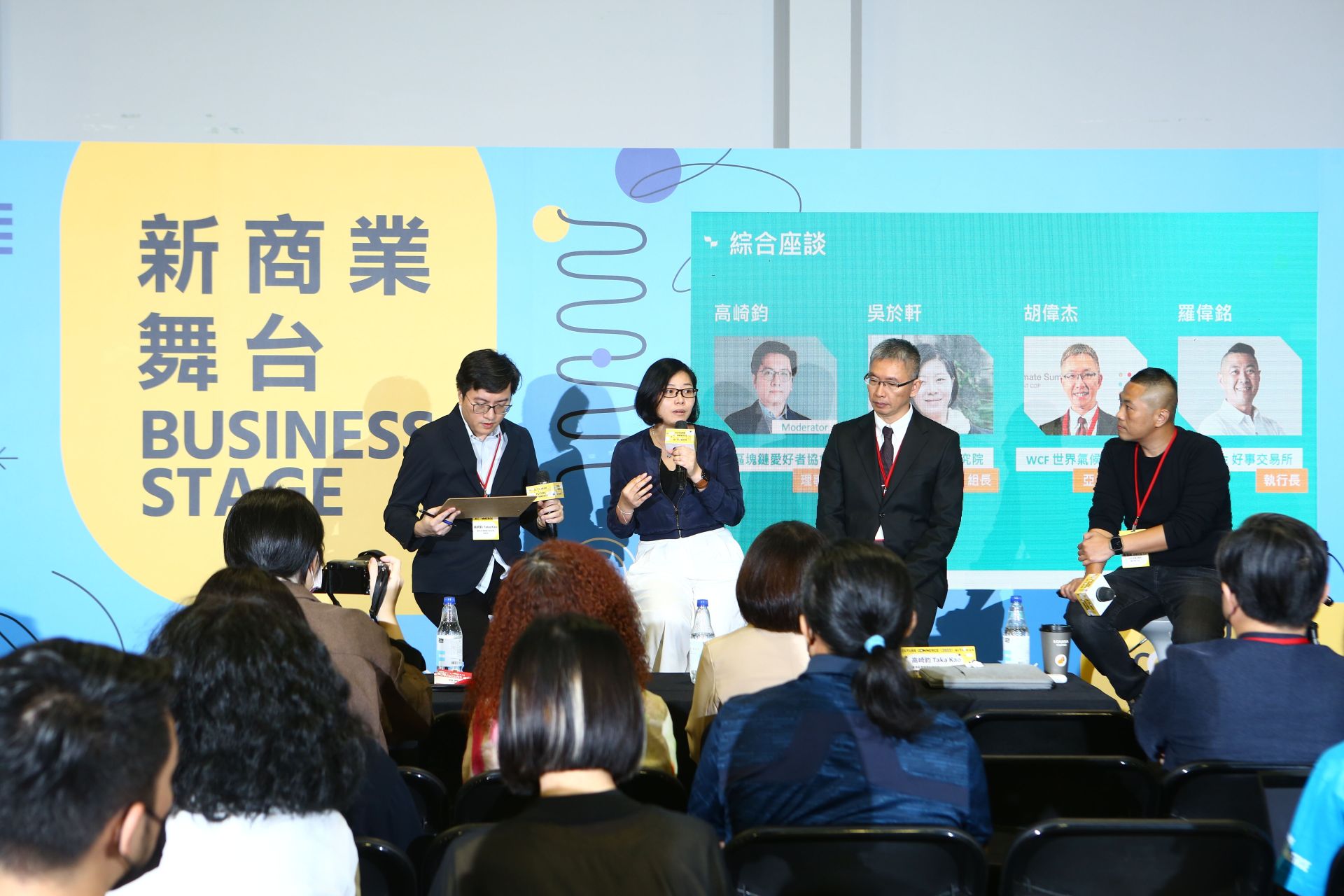 2023未來商務展|新商業舞台,第二屆去中心永續發展論壇。左1:臺灣區塊鏈愛好者協會理事長高崎鈞,左2:TDRI 設計研究院產業前瞻組組長吳於軒,右1:WCF 世界氣候基金會亞太區代表胡偉杰,右2:好事交易所執行長羅偉銘。圖片來源/2023未來商務展