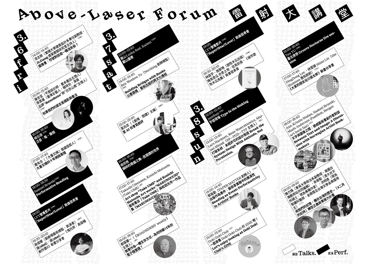 本屆草率季吸引多家國際獨立出版與創意單位深度參與。挪威藝廊「Northing Space」呈現日本藝術家濱田陽平與Daniela Bergschneider的舞蹈雕塑共演;卑爾根藝術書展(Bergen Art Book Fair)主辦單位「Pamflett」則計畫於今年4月帶領台灣創作者前往挪威參展。此外,亮點攤位還包括日本傳奇編輯都築響一、比利時出版平台Walkscapes等。在「雷射大講堂」中,多位講者針對出版、劇場與建築展開跨界對談,如都築響一分享書籍製作與電子報經營的生活平衡、PAPER MATTER聚焦出版的持續實踐潛能、莫兆忠思考AI時代下的劇場評論,以及漆志剛探討圖像書的符號對話。政治學者陳方隅、作家朱宥勳與洪明道則共同分享「二月的記持」接力寫作計畫,現場更有Samuel Brzeski帶來的表演式朗讀,將語言視為不穩定媒介進行波動實驗。