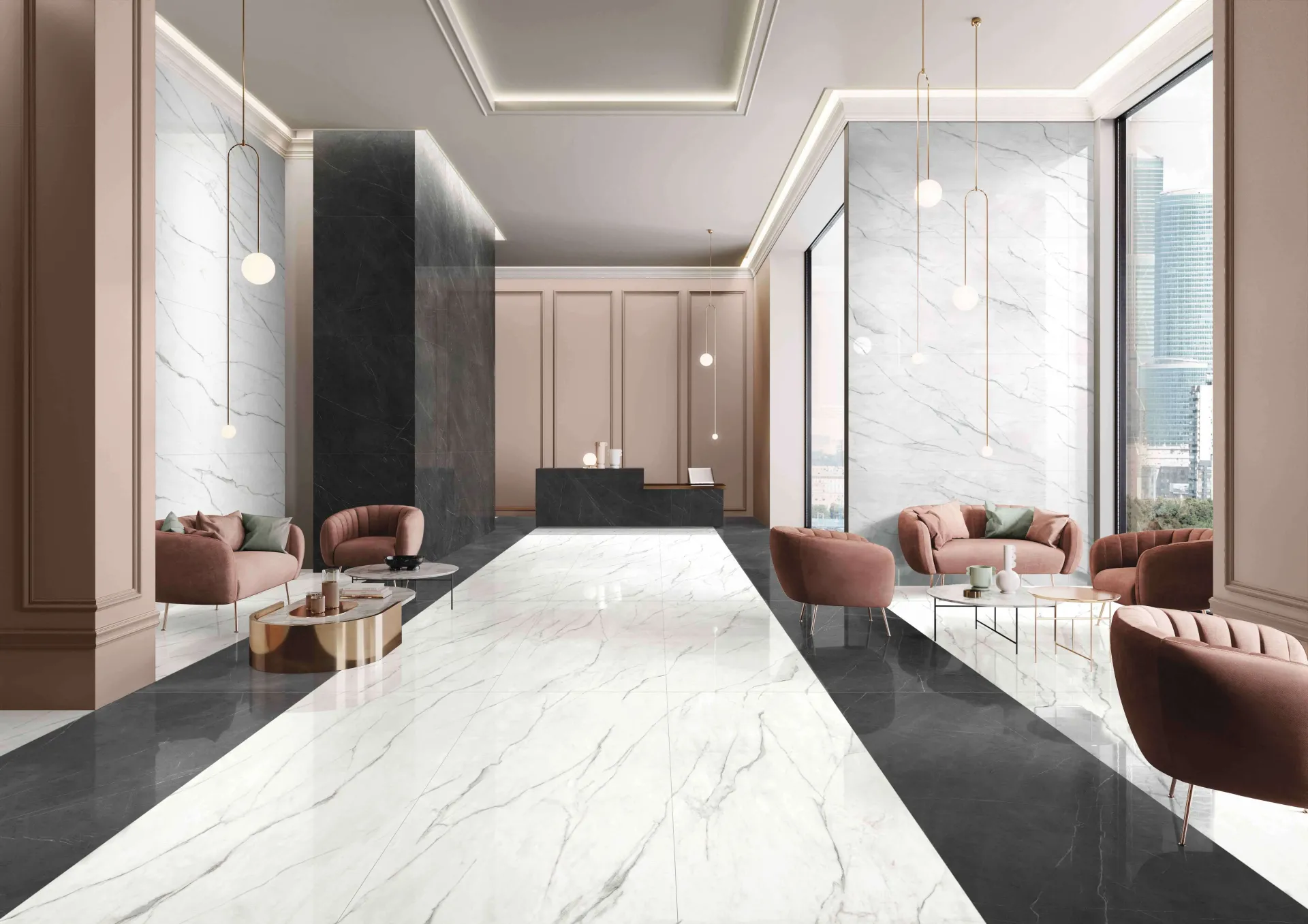 雪白銀狐(亮面)_接待大廳+ 亞曼尼灰。圖片來源/冠軍建材。經過三年潛心研發的「瓷藝中板(MASTER ART)」,將冠軍磁磚工藝關鍵技術上的卓越優勢展現淋漓盡致,透過無限連紋、順序連紋與順紋工法的精心設計,亮面與霧面巧妙搭配,讓極具藝術張力的奢石紋理,達到整面空間延伸感強的效果,室內外場域運用自如,滿足空間設計各種需求。