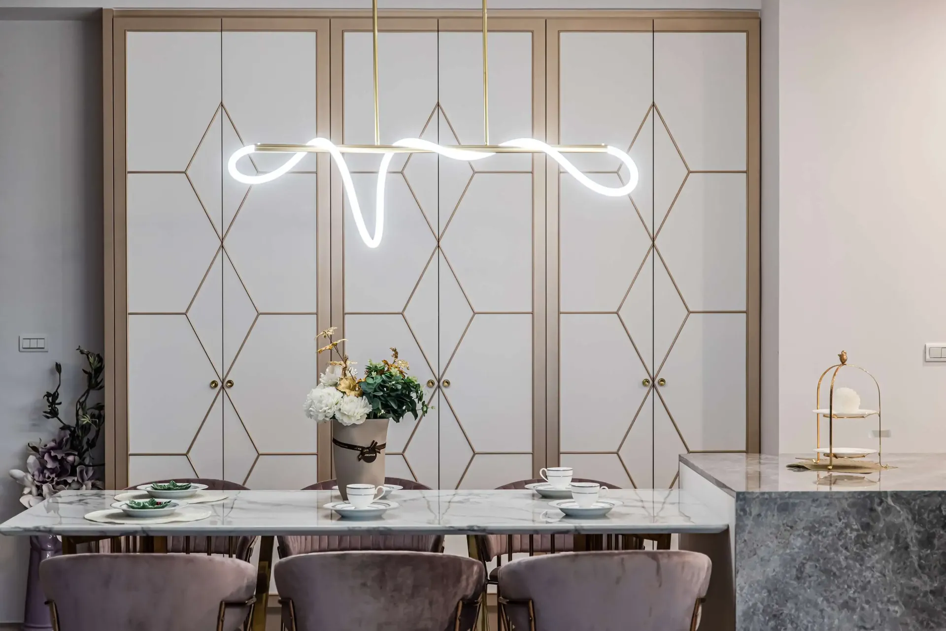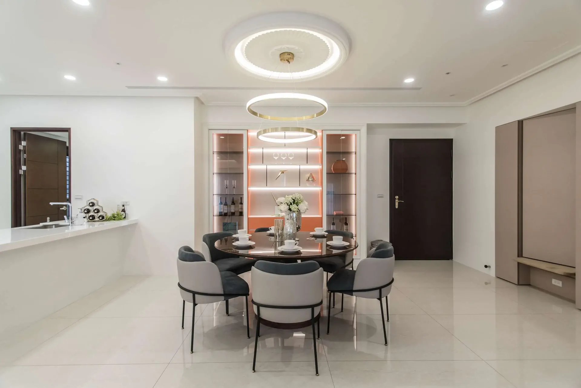 黃子溱 2022 MUSE Design Award 銀獎得獎作品《森景澤 13A3》圓邊天花板、室內立面、家具和陳設以及照明設備的設置意味著和諧的氛圍;巧妙地向房子主人傳達黃子溱對他們的祝福。特別挖空了電視牆的兩側,裝上了內建的擱板,用來放置愛侶們的珍貴藏品,一起快樂地享受甜蜜的日子。整合各種色調來完成公共區域,在天花板、牆面、各種家具和燈具上巧妙地運用出彩的玫瑰金色,巧妙地將古典魅力引入空間。此外,設計交錯的矩形和分割線形圖案,表現出不同領域的鮮明特色,打造了豐富的視覺感受。佈置豐富的大型儲物櫃和廚房中島,華麗的內裝卻能優美的協調各個特色,《森景澤 13A3》也展現了它獲獎的實至名歸。