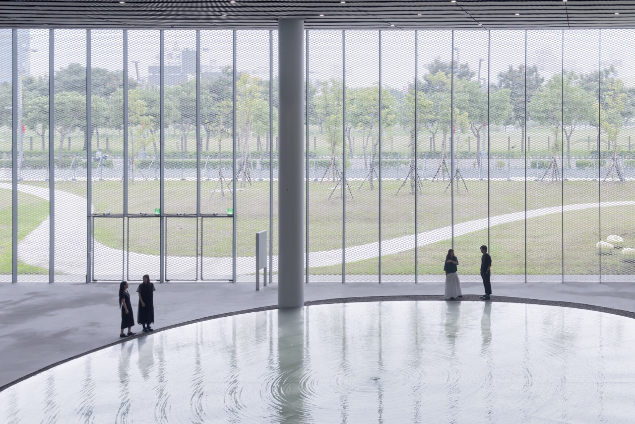 館方特別提到,建築設計刻意避免阻擋民眾穿越公園的原有動線。人們可以不為了看展或借書而走進綠美圖,只是單純經過、休息、感受空氣流動。入口處的水池大廳成為第一個公共節點,觀眾在此取得展覽資訊後,再選擇是否進入美術館或圖書館場域,讓文化參與保有彈性與自由。
