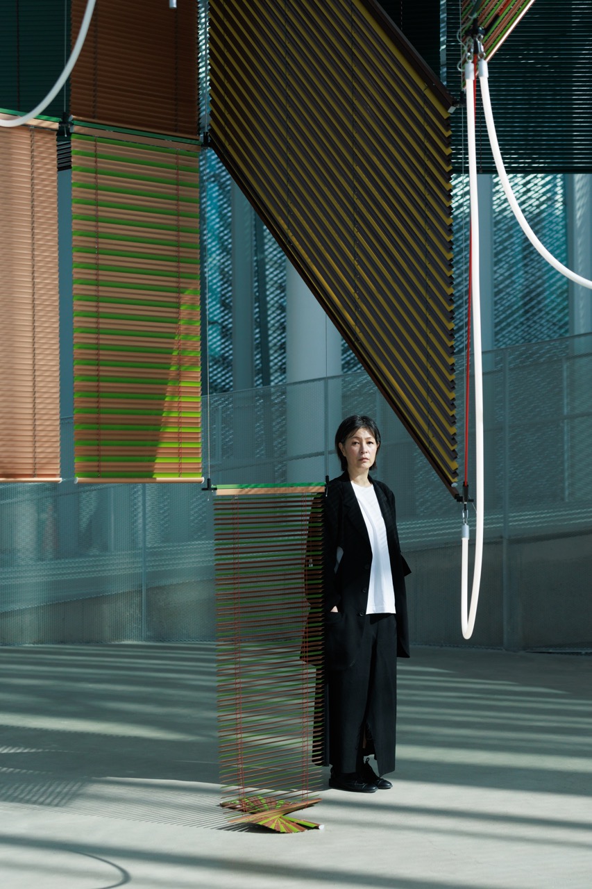 梁慧圭的《流動奉獻–樹蔭三合》懸置於大廳空間,白天隨著自然光線變化,作品在坡道不同角度展現層次;入夜後,燈管與綠色雷射光在空間中閃爍,形成宛如螢火蟲般的視覺節奏,讓觀眾感受到時間與環境的轉換。