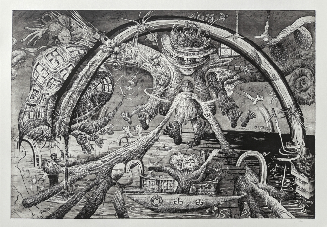 朝井颯志|彩虹門|水松石版;銅版蝕刻|3.5 x 112.5 x 82 cm|2025。透過寓言式敘事回望當代文明與自然之間的張力。
