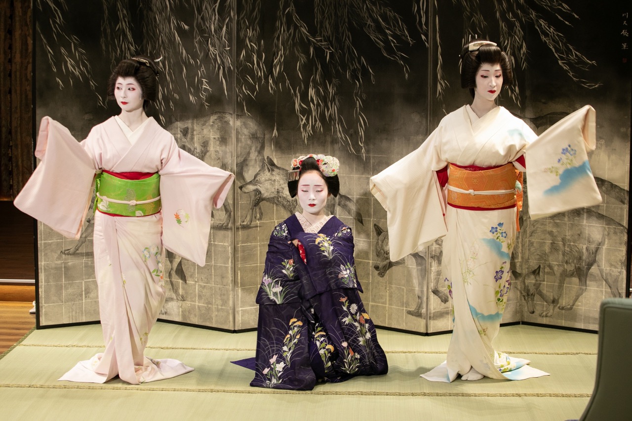 京都祇園甲部的藝伎與舞伎來台演出——藝伎 美羽子小姐、舞伎 穗乃佳小姐、藝伎 多都葉小姐,於日本畫家川又聰先生的代表作《六曲一雙屏風》系列(狼 - 風息) 前演出。(photo credit:和風美咖MI CAFETO)