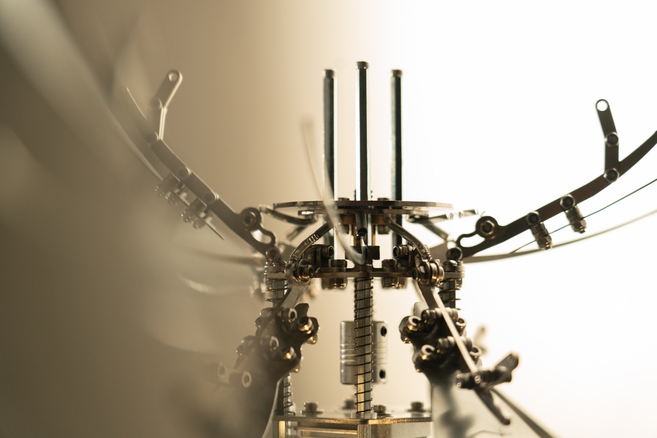 黃冠勛《Unwilt》(2025),以金屬與步進馬達構成的動態裝置。作品名稱「Unwilt」意指「不凋萎」,在機械律動中探討生命力與物理結構的延展性。(圖片提供:黃冠勛)