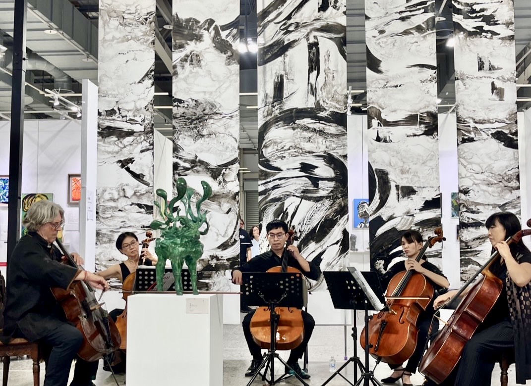 今年展會也結合音樂與公益,尚畫廊策畫「五把大提琴公益音樂會」,由法國音樂家 Franck Bernède 博士領軍演出,並與法國藝術家 Paule Riché 的五米高畫作《Brush & Bow》聯動演出,邀請觀眾自由捐款支持台南菁寮天主堂修復計畫,以藝術實踐療癒與關懷行動。