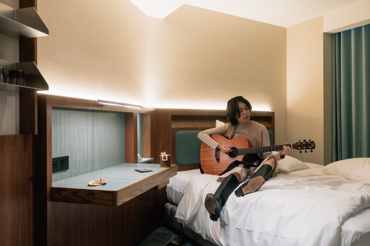 Oani 的房型規劃以「回復」為核心,從單人至雙人房型皆維持相對克制的坪數設定,避免多餘配置,讓空間回到最基本的使用需求。客房內部以低彩度色系與自然材質為主,床鋪高度、動線寬度與照明配置皆經過細緻推敲,使視線與身體能在進入房間後自然放鬆。部分房型引入大片窗景,讓城市光線成為室內的一部分;夜間則可透過可調式燈光,轉換為更適合休息的節奏。整體房型設計不追求視覺張力,而是透過比例、觸感與安靜的細節安排,讓旅人在短暫停留中,重新找回與自身節奏對齊的狀態。