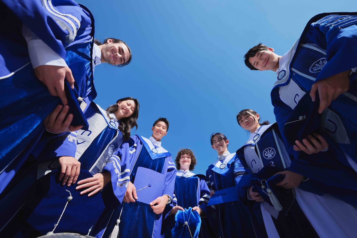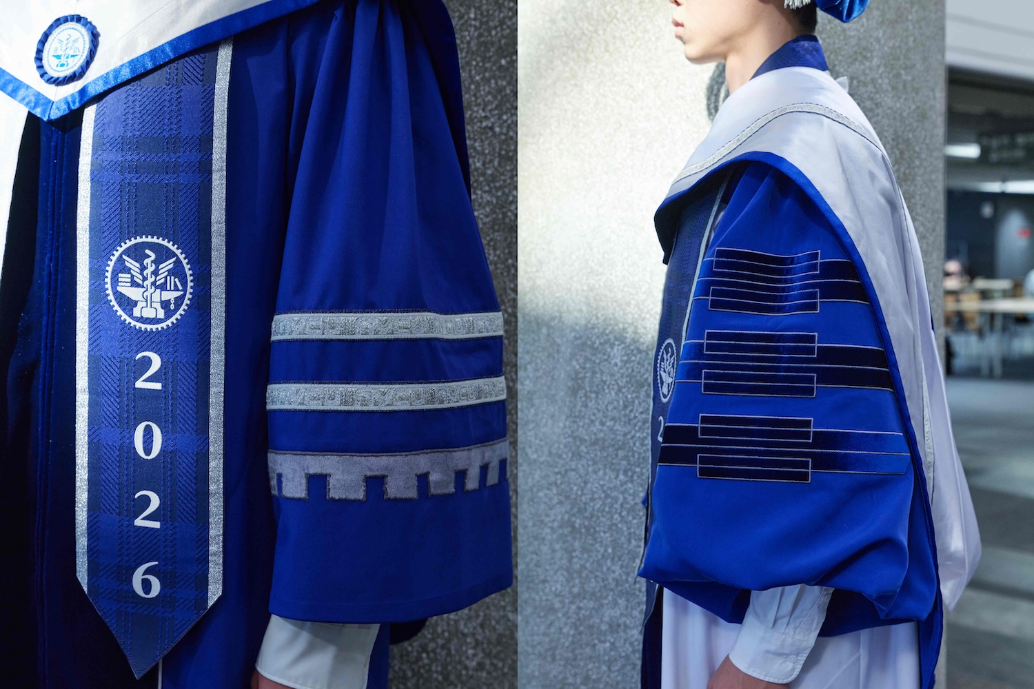 全新學位服的設計起點源於陽明交大合校後的校徽識別系統,承載了「仁心仁術、真知力行、知新致遠、崇實篤行」的創校理念與歷史記憶。在視覺語彙上,周裕穎將校徽中的「齒輪」元素進行延伸,精準地配置於披肩與袖口等關鍵部位。齒輪不僅象徵連結與推進,也回應了校方對過去學術累積的尊重與對未來科技突破的期許;而設計中融入的「飛翔意象」則寓意畢業生迎向挑戰、展翅高飛。整體色系選用藍天與白雲的意象,象徵學子在知識的天空中自在探索與展翅前行。