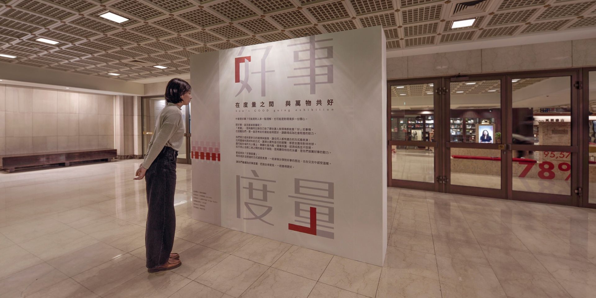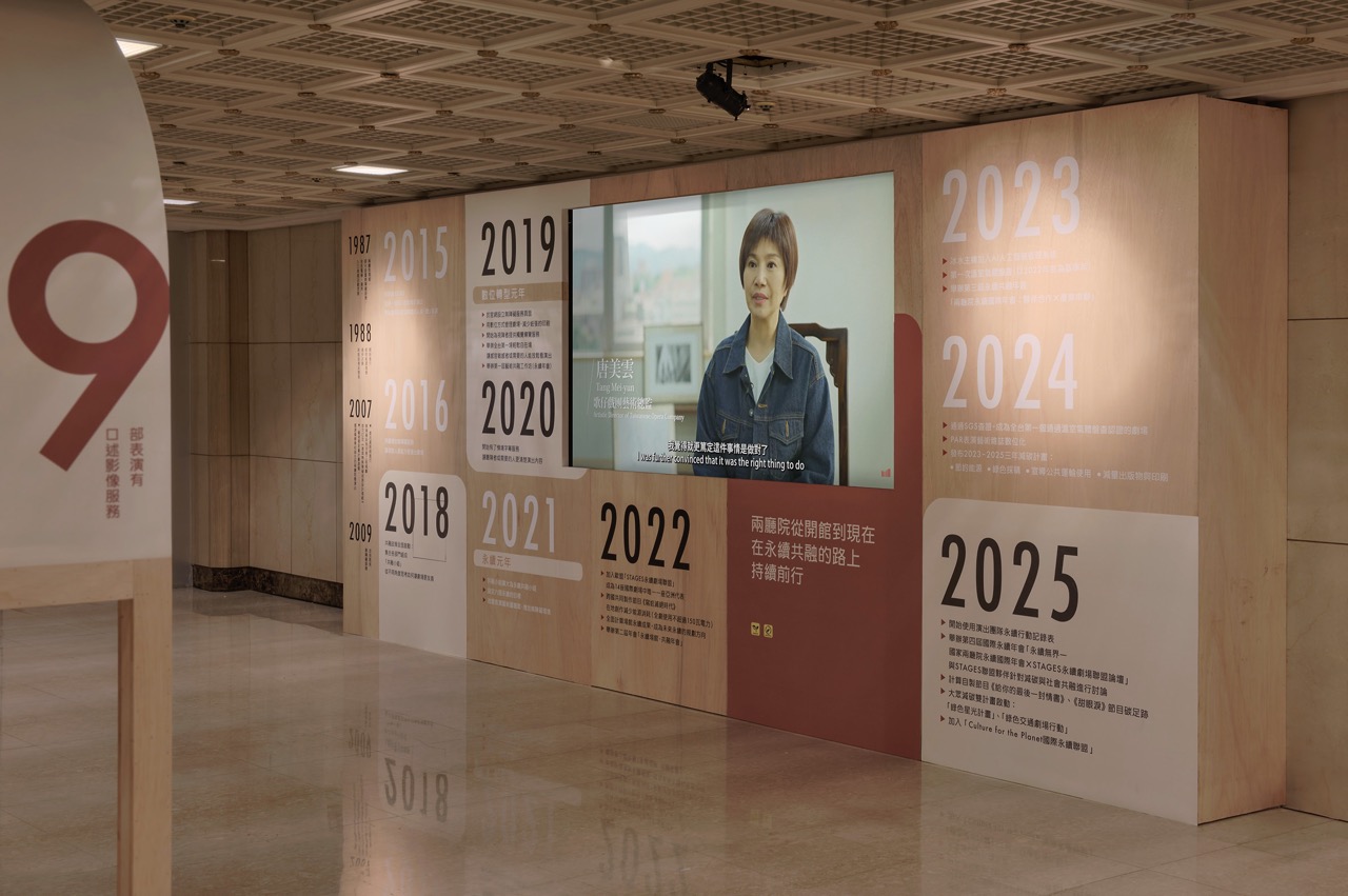 國家兩廳院這座近 40 年歷史的表演藝術場館,推出了《好事度量》永續特展,特展三大展區分布在國家戲劇院諸多公共空間,從展示開館至今不同年代的紙本票券,計算至票券電子化後省下的用紙,可鋪滿25座藝文廣場的具體度量;到製作節目的永續觀照與共融的細膩服務,在在證明,表演藝術也可以成為一千種救地球的方法之一。