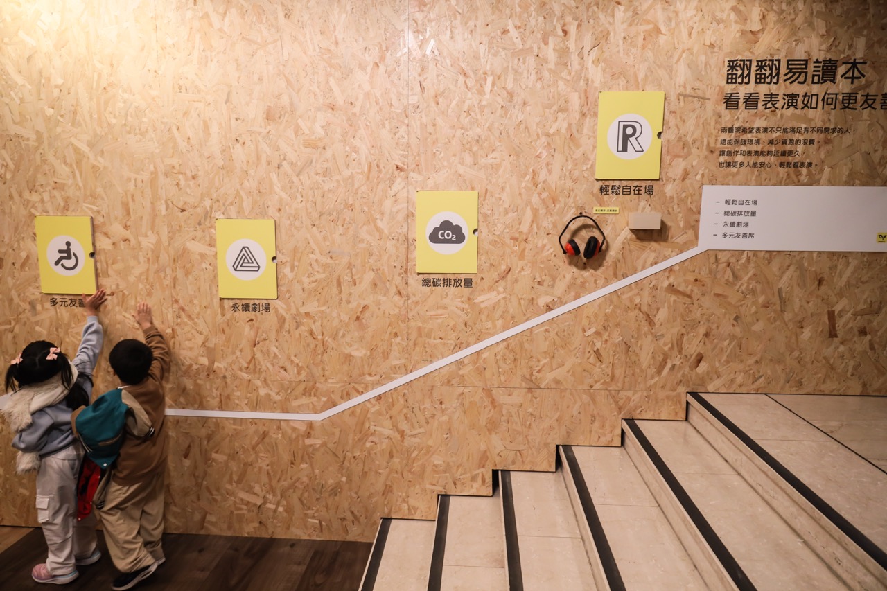 兩廳院也與華康字型合作,採用以「通用設計」(Universal Design)理念開發、辨識度高的「華康UD黑體」,再搭配編輯後更趨近易讀的文字內容與段落安排,將原本較為複雜的永續資訊轉化為清晰易懂的展板說明,讓各年齡層族群的視覺條件或閱讀習慣到相對輕鬆掌握重點的方式,做到「永續」與環境友善。