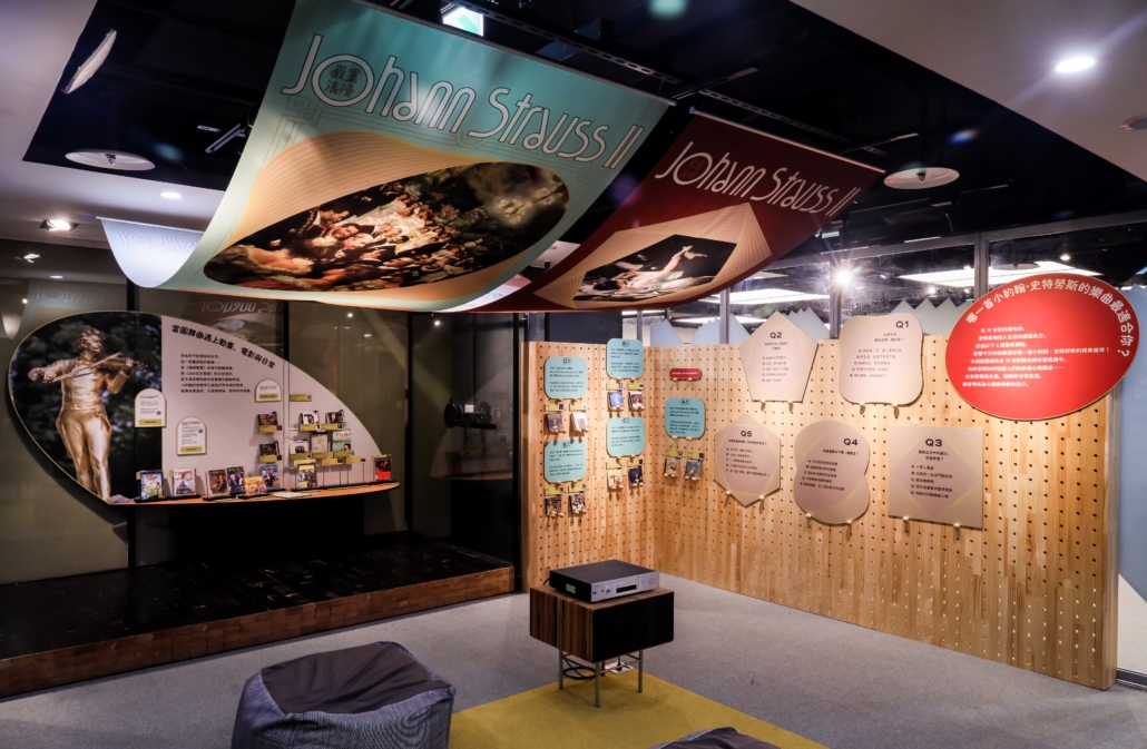 展區設計以音樂的韻律與節奏為靈感,採用圓形與橢圓形線條呈現「旋轉感」,部分展板懸掛於空中或以立體折角方式展出,營造流動的氛圍。展場中展示的《蝙蝠》總譜手稿,更讓觀眾能一窺作曲家的原創筆跡。參訪觀眾可在展區地面依腳印體驗華爾滋的三拍子舞步,或於「測驗區」透過互動方式挑選入門曲目。