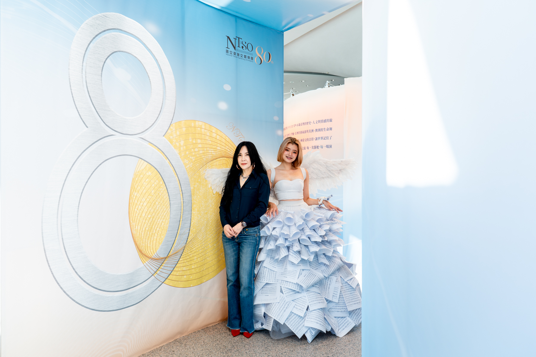 設計師黃秀瑾以千張樂譜縫製的長擺禮服,象徵八十年間累積的音樂能量,是展場最受觀眾注目的亮點之一。