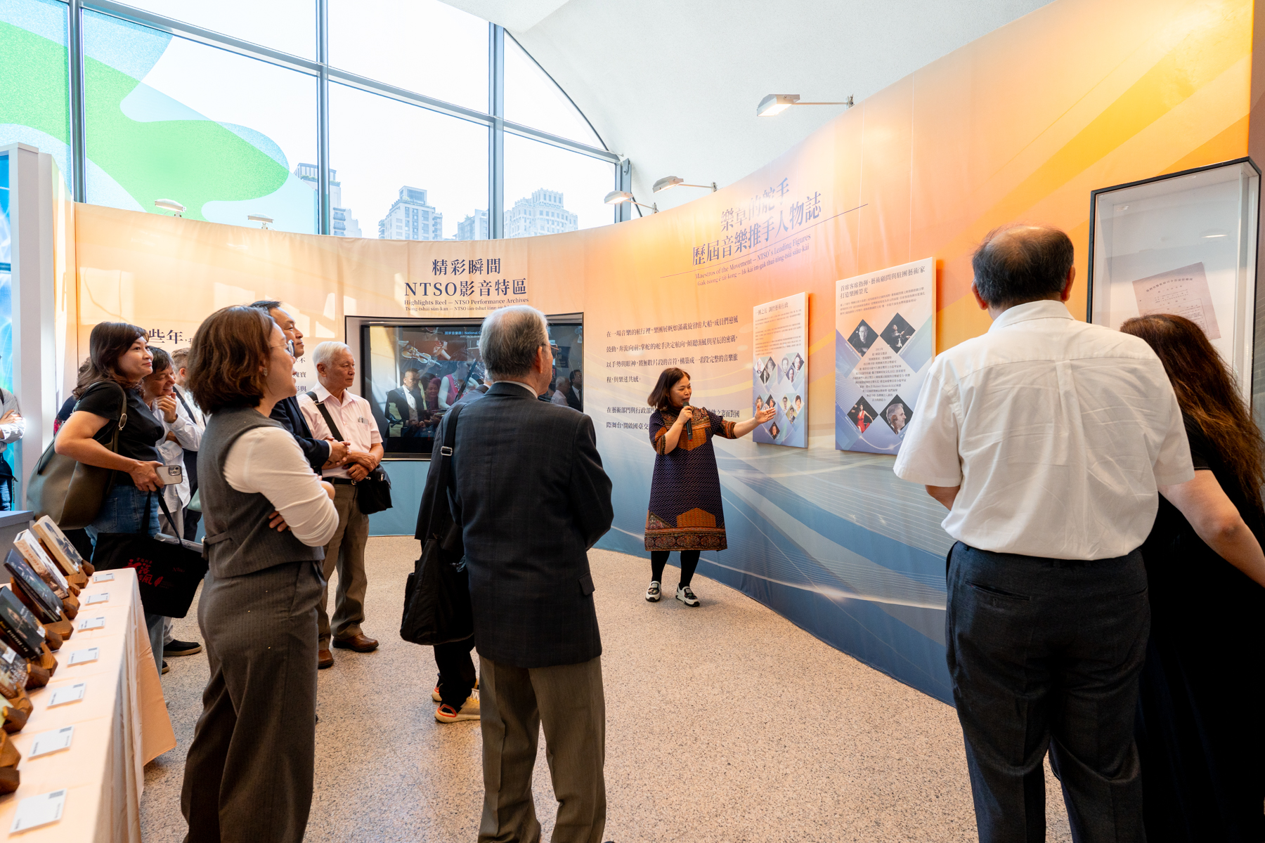 國臺交副團長林麗如(右 3)於《時間的樂譜》展場中進行導覽,以策展視角梳理樂團八十年的歷史線索與文化脈絡。